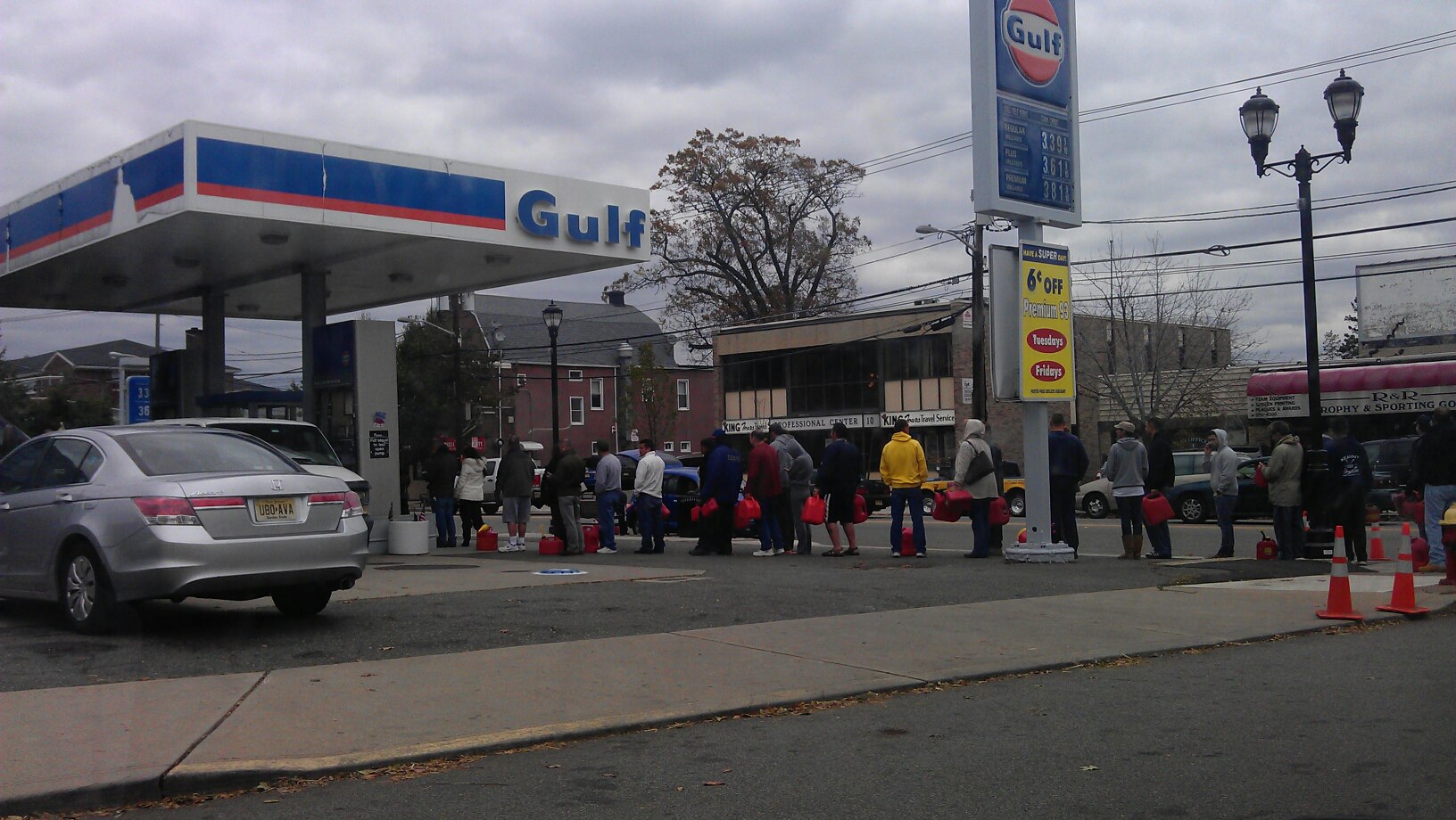 Il y a actuellement de très longues files d’attentes pour les quelques stations service encore ouvertes à New-York. Dans la photo qui suit, il était décrit que la file de personnes à pieds s’étirait sur 2 patés de maisons, alors que la file de voitures s’étirait sur 8 patés. La personne qui a pris la photo est propriétaire d’une Volt et indiquait qu’il avait réussi à se charger pour effectuer ses déplacements en mode électrique.