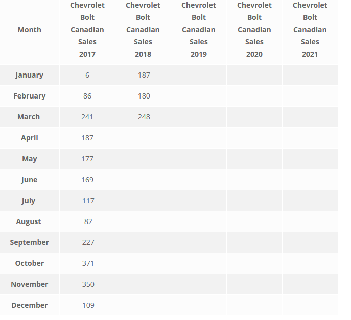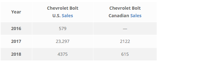 Ainsi, selon le site de statistiques de ventes de véhicules, goodcarbadcar.net les ventes au Canada en 2017 de Chevrolet Bolt ont totalisé 2122 Bolts.