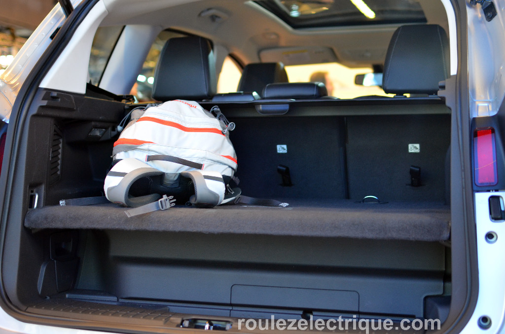 D’abord, la C-MAX a une belle allure. La carrosserie est la même pour la version Energi, qui est une hybride rechargeable, que pour la version essence. La C-MAX possède une batterie au lithium-ion de 7 kWh, qui occupe une portion significative de l’espace arrière, ce qui enlève la possibilité d’avoir une roue de secours, ce qui est assez répandu auprès de beaucoup de voitures électrifiées qui n’ont qu’un compresseur à air pour se dépanner, on peut penser ainsi à la Volt, la Focus électrique et la Fusion energi, qui ont le point commun de ne plus avoir de roue de secours. La stratégie d’électrification de Ford est d’utiliser des voitures existantes et d’y adapter une propulsion hybride rechargeable. Ainsi le volume pour mettre la batterie au lithium est nécessairement moindre que pour une voiture qui a été conçue du départ pour être électrique rechargeable. Voici une photo du coffre arrière de la C-Max: