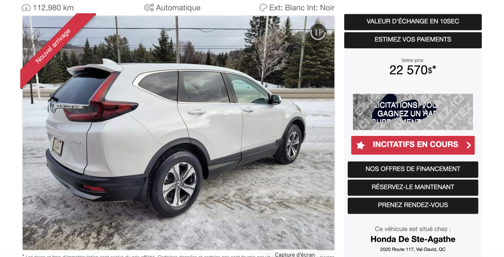 Savez-vous qu’il y a énormément de voitures à essence à vendre de trois ou quatre ans ? C’est que la location est très populaire au Québec. En voici un bel exemple à 22 570 $ :