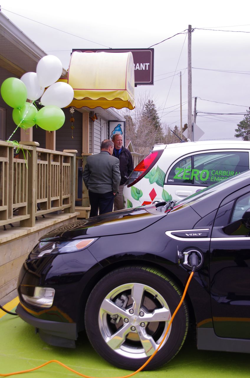 Avec l’inauguration de bornes publiques à Trois-Rivières lundi prochain, il sera maintenant possible pour un propriétaire d’une voiture toute électrique de la région de Montréal ou de Québec de se rendre à Grandes-Piles sans inquiétude de tomber en «panne» en faisant un arrêt à Trois-Rivières pour se recharger !!