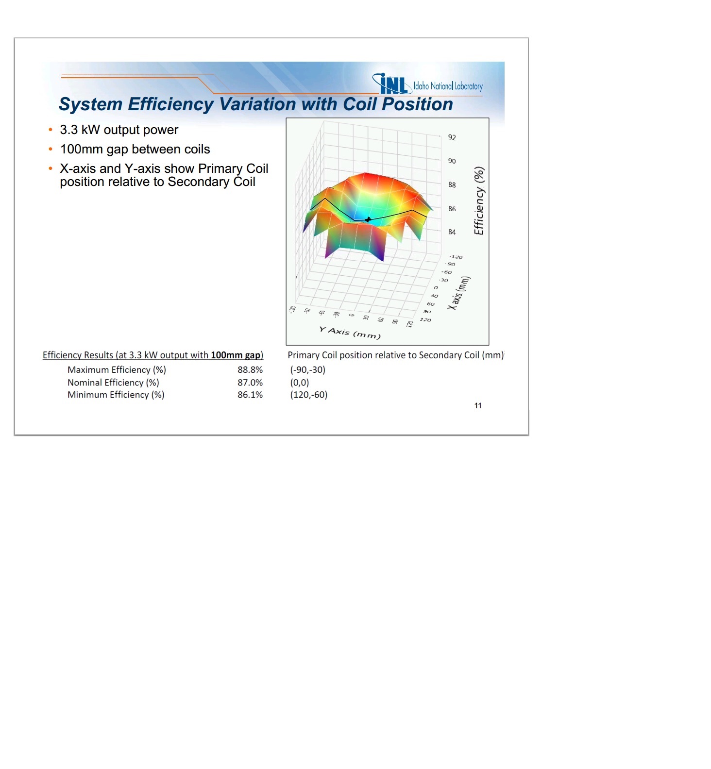 Ce système a aussi été évalué scientifiquement par le département américain de l’énergie (US department of Energy). Leur rapport indique également que l’efficacité globale est située entre 86.1% et 89.2%. L’alignement/distance entre le véhicule et la plaque d’induction est le facteur principal de la variation d’efficacité. Ils ont mesuré l’efficacité globale selon les positions relatives entre la plaque d’induction et l’adapteur de voiture. Voici la figure de rendement obtenue: