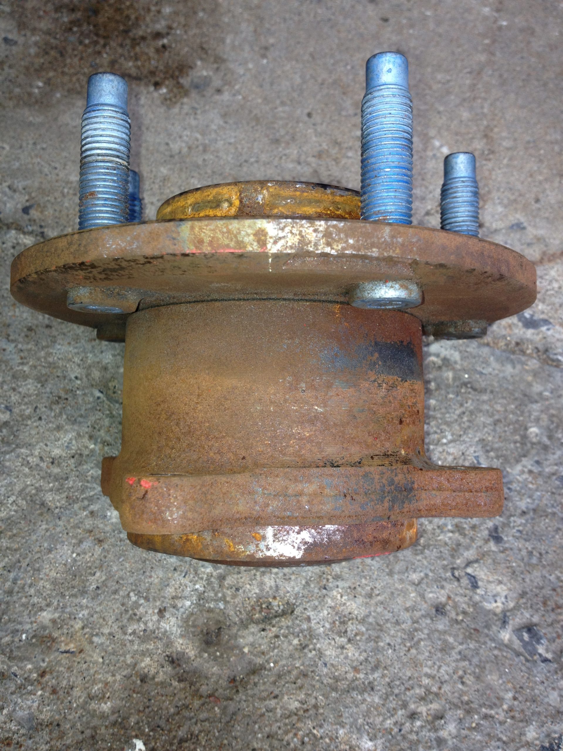 Voici une photo d’un hub de roue arrière de Volt 2011 avec 17000 km parcourus. La rouille que l’on voit est une fine couche de rouille superficielle. Les hubs de roues ont une tendance plus forte à rouiller, parce qu’ils sont assemblés en les chauffant (par induction). Ces pièces n’étant pas peinturées, elles se mettent à rouiller dès qu’ils sont mis au contact avec l’air et l’humidité. Une fois passée à la brosse d’acier et repeint, cette pièce a retrouvé l’aspect du neuf et a été réinstallée sur la voiture. J’ai profité du fait d’avoir le hub en main pour y rajouter de la graisse en la forçant à passer par le seal sur la base du hub (coté droit sur la photo). Ceci va maximiser la lubrification du roulement dans le hub, pour en maximiser la durée de vie. Encore un fois, c’est une opération qu’un garage/concessionnaire ne fait pas. Les hubs sont vendus comme unité sans entretien avec lubrification “à vie”. (Sauf que moi, j’aime bien qu’ils aient une vie très très longue…)