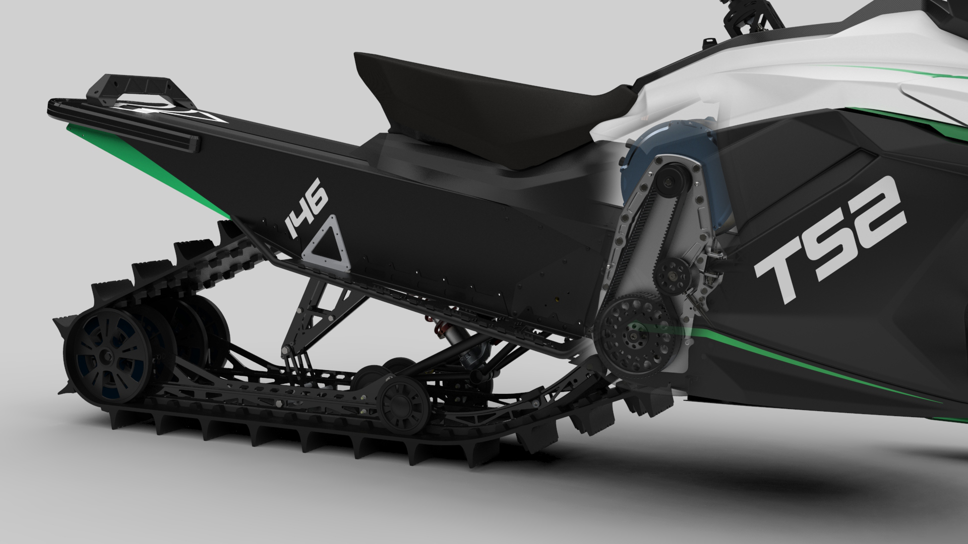 Ce qui permet ainsi d’obtenir un tel couple à basse vitesse tient au fait qu’il n’y a pas de transmission CVT dans la motoneige électrique. On a un moteur électrique à aimant permanent qui actionne une courroie crantée qui fait tourner directement la chenille. Pas de glissement de courroie, pas d’usure due au glissement. Le poids de l’ensemble transmission est également très faible.