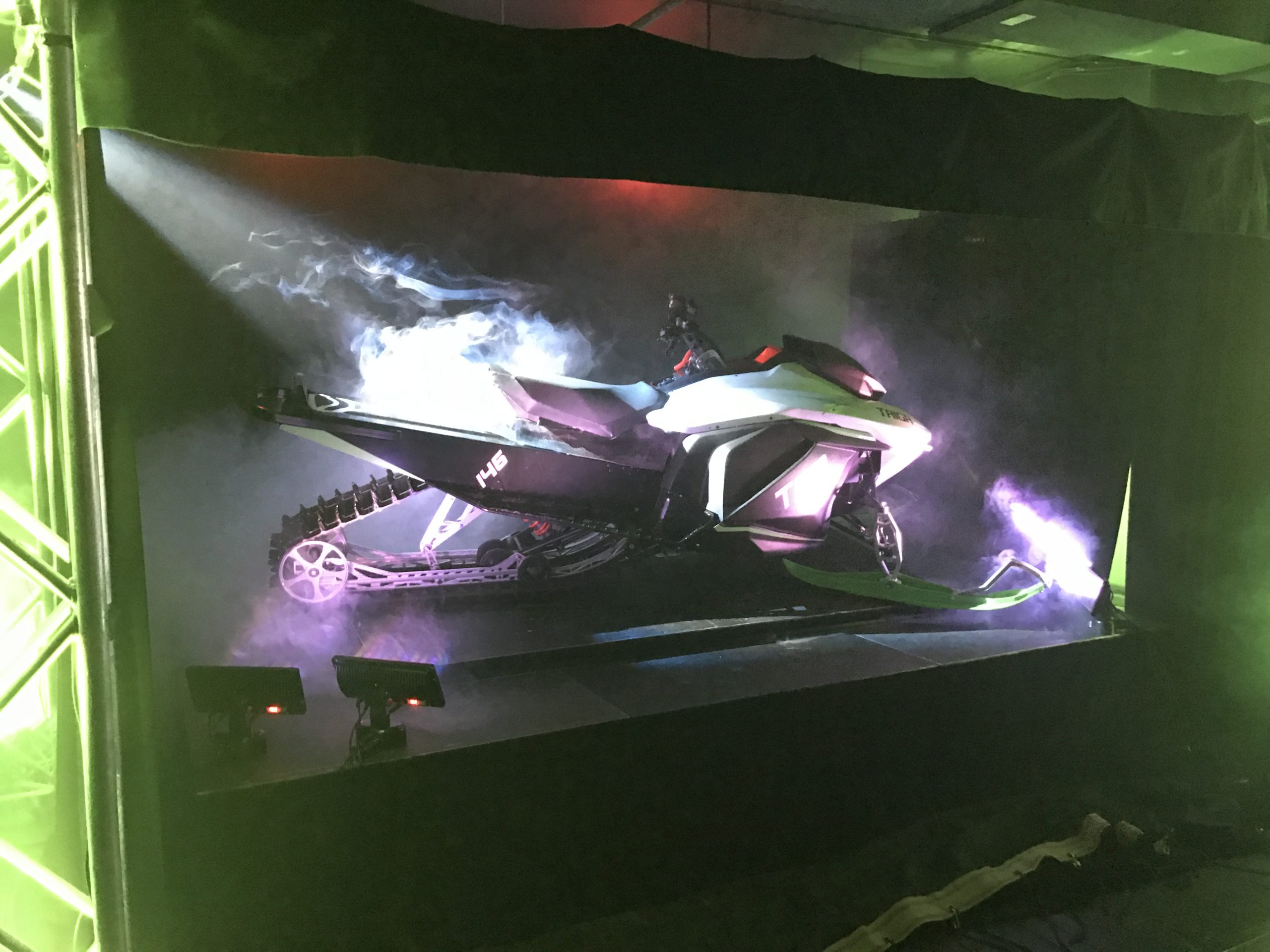 La présentation nous a dévoilé des éléments de design extrêmement intéressants, dont certains qui à notre opinion, sont supérieurs à ce qu’on retrouve sur les motoneiges à moteur à essence actuellement offertes! D’ailleurs, une statistique importante à connaître: actuellement, 60% des motoneiges vendues neuves sont encore, en 2018, propulsées par des moteurs 2 temps!!! Un moteur 2 temps émets plus de pollution atmosphérique que 60 automobiles combinées. Ne vous demandez plus pourquoi votre habit de motoneigiste sent l’huile brûlée après une journée de balade…