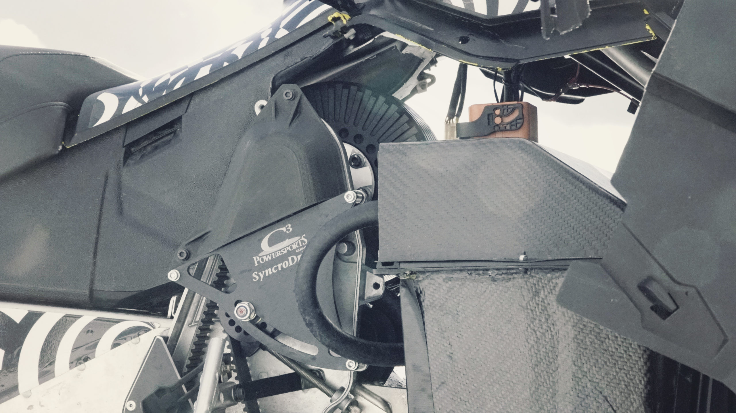 Un autre élément de design unique est la suspension avant. Au lieu d’avoir 2 amortisseurs, il y en a un seul, qui est monté de façon à également permettre au conducteur de faire pencher vers l’intérieur la motoneige dans un virage, ce qui aide à la conduite. Pourquoi ne peut-on pas réaliser la même chose avec une motoneige à moteur thermique? Parce que le moteur occupe l’espace où irait l’amortisseur!!! C’est un autre avantage d’une propulsion électrique.