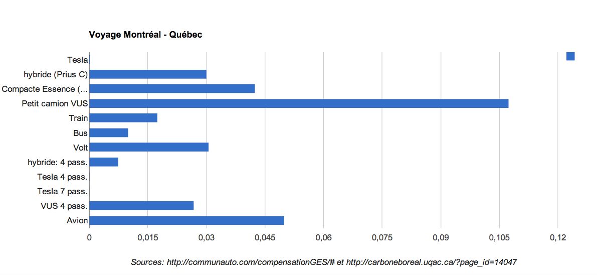On peut donc affirmer sans l’ombre d’un doute que le véhicule électrique est présentement au Québec le mode de transport qui génère le moins de GES. Et ce par une très grande longueur d’avance. Mais il faut aussi retenir que les véhicules électriques, hybrides et à autonomie prolongée sont à leur maximum d’efficacité lorsque toute les places du véhicule sont occupées. Même un VUS avec quatre passagers ne génère pas tellement plus de GES que le train. Et si on pousse le raisonnement au maximum, ça signifie donc qu’une Tesla avec 7 passagers (5 adultes et 2 enfants) émet 490 fois moins de GES que le train!