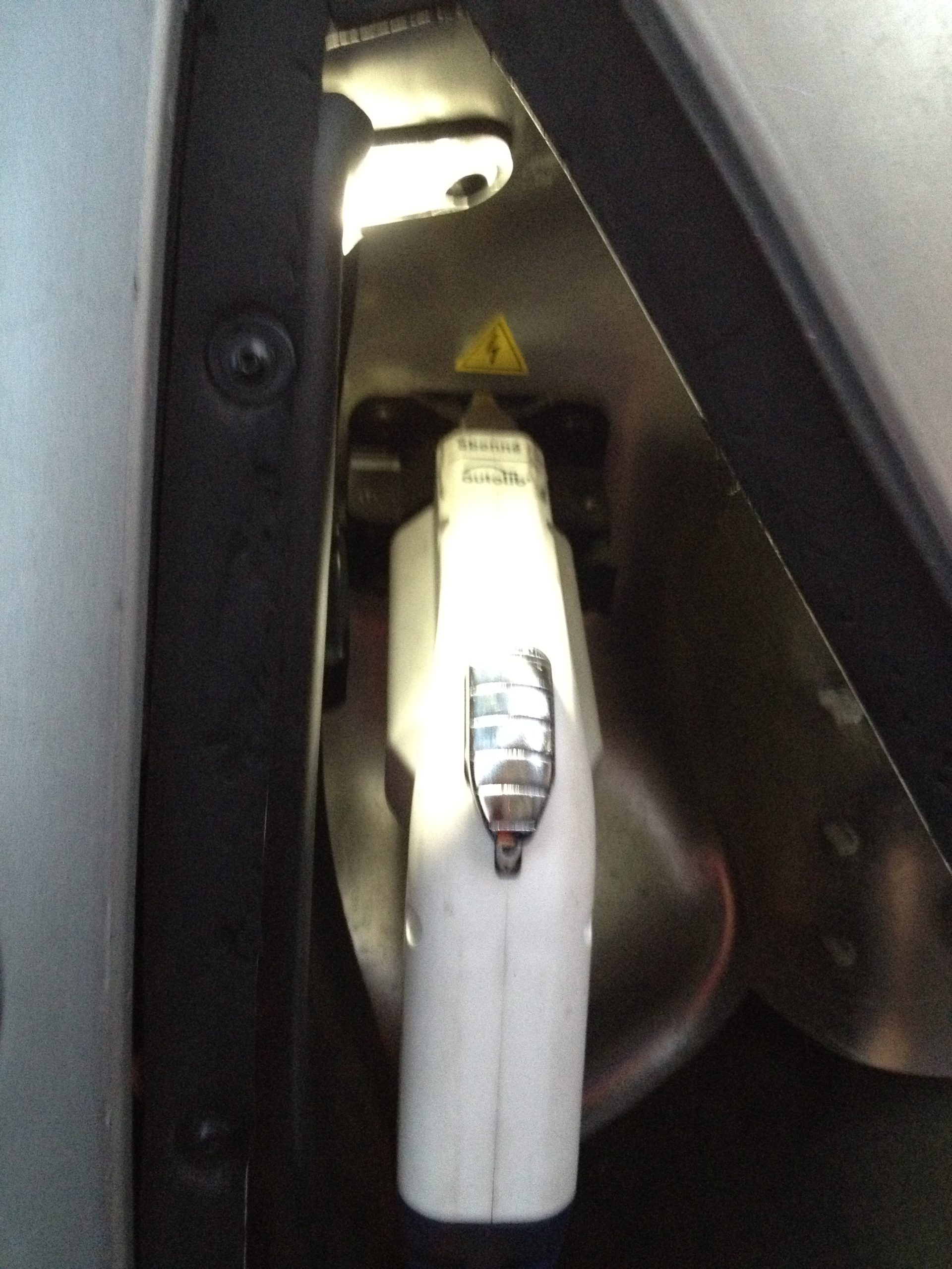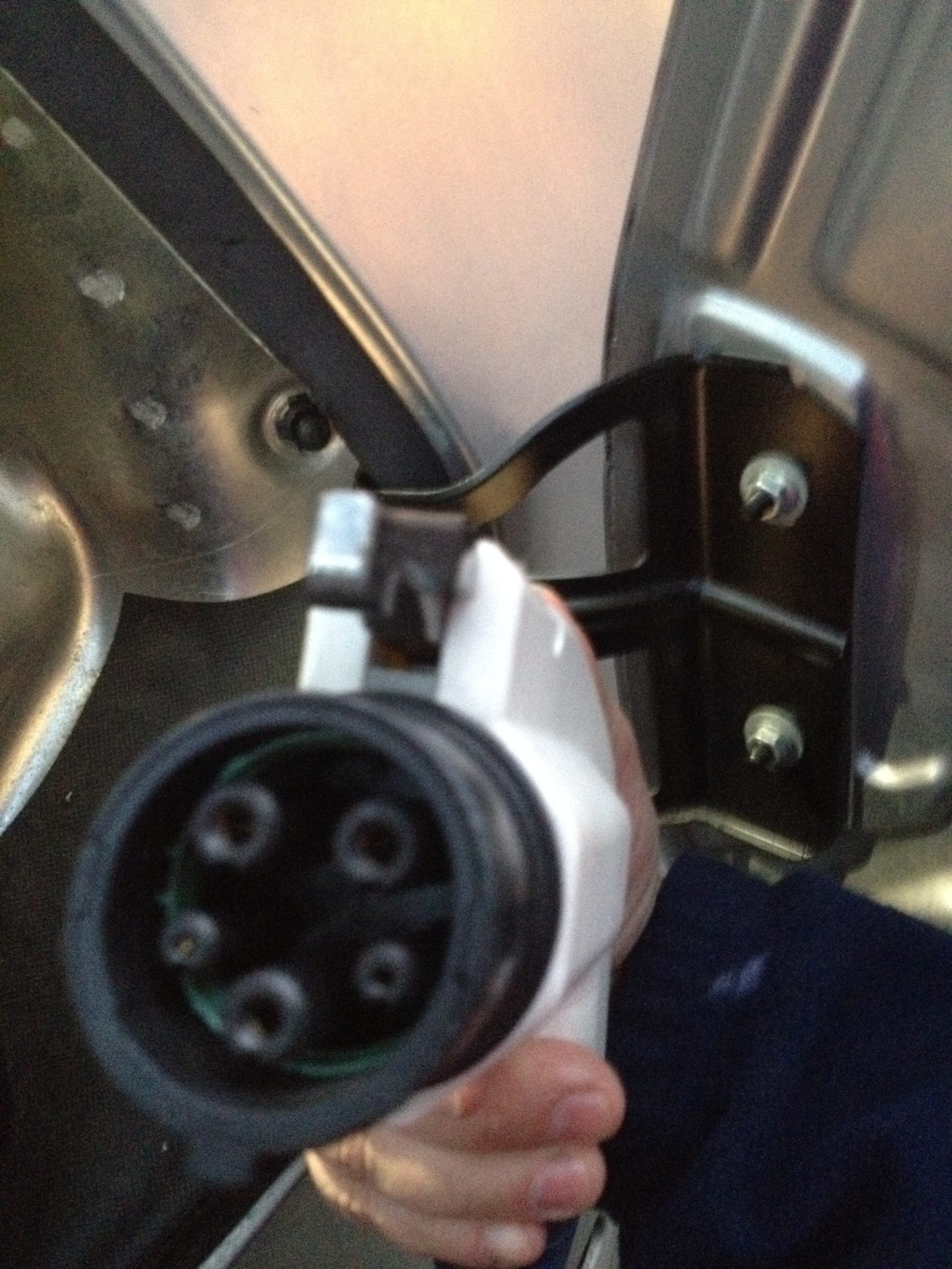 Ajout: voici deux photos, prises de soir, montrant a) Une fois la porte de recharge ouverte, l’éclairage à LED pour aider à manipuler le pistolet de la borne de recharge, et b) la vue des connections du pistolet.
