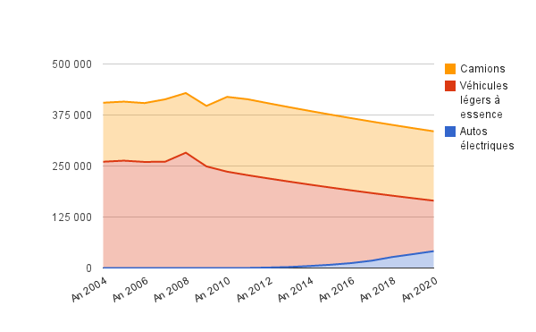 En fait, je ne sais pas si le ministre a tenu compte des tendances de vente des véhicules légers avant de fixer ses objectifs, mais il savait probablement que les ventes de ces véhicules sont en baisse de Source des ventes historiques: CCAQ (http://www.ccaq.com/fr/la-ccaq/statistiques.statistiques-pour-le-quebec-.php) Note pour la projection: La projection des ventes véhicules légers est basée sur la tendances des dernières années. J’ai également appliqué cette tendance aux ventes de camions même si la tendance des dernières années est à la hausse. C’est donc un scénario «optimiste» basé sur différents indicateurs (coûts, d’utilisation, amélioration des transports en commun, vieillissement de la population, etc).puis plusieurs années maintenant. Donc, si cette tendance se maintient, l’objectif de conversion de ce type de véhicule à l’électrique devient plus facile à atteindre d’année en année. Quand on regarde le tableau, on voit d’ailleurs que si on regarde les ventes actuelles d’autos électriques, il est loin d’être impossible qu’elles atteignent 25% des ventes si les ventes de véhicules légers ne sont que de 165 000 unités en 2020. Le diable est dans les détails Peut-être êtes-vous surpris d’apprendre que les ventes d’autos sont en baisse? En fait, la baisse des ventes de véhicules légers semble en partie attribuable à l’augmentation des ventes de camions du à la popularité grandissante des véhicules utilitaires sport. Donc, l’objectif de 25% des ventes de véhicules légers n’est pas si ambitieux que ça car si la tendance se maintient, les ventes de véhicules légers ne pourraient représenter que la moitié des ventes de véhicules en 2020. Bien entendu, d’ici là, plusieurs modèles de camions électriques ou à autonomie prolongée seront offerts, donc un certain pourcentage des ventes de camions devrait être électrique. Effet des incitatifs sur les ventes de VÉ Certains déplorent que les incitatifs sur l’achat des véhicules électriques diminuent trop rapidement, ce qui pourrait mettre en péril l’atteinte de l’objectif. Bien qu’une prolongation du programme pourrait certainement accélérer l’adoption de cette technologie, il est clair que le gouvernement mise sur une baisse de coûts des voitures électriques à peu près équivalente à la baisse des subventions. Déjà, GM a annoncé que la Volt 2013 pourra parcourir plus de km en mode électrique que la version actuelle alors que le prix demeurera le même. Donc il semble clair que la technologie devient de plus en plus concurrentielle, au point de pouvoir bientôt s’affranchir de subventions. À cela, il faut ajouter la forte possibilité que le prix du pétrole va continuer à augmenter, ce qui va contribuer à rendre les voitures électriques plus attrayantes. Donc, si on se fie au succès actuel du programme d’incitatif à l’achat de véhicules électriques (le Québec est de loin la province qui achète le plus de vé), il semble que la stratégie qui consiste a donner un «boost» aux ventes de véhicules électriques fonctionne. Pour atteindre l’objectif, investir dans les incitatifs ou dans la réduction du parc automobile? Pour atteindre l’objectif de 25 % des véhicules Léger, il y a deux stratégies possibles : mettre le plus d’incitatifs possible dans la vente de véhicules électriques ou essayer de contenir les ventes de véhicules légers le plus possible. Compte tenu du fait que les ventes de camions sont en progression au Québec, une stratégie axée vers la réduction des ventes de véhicules neufs semble préférable si on veut réellement atteindre les objectifs de diminution des gazs à effet de serre. Il faut aussi mentionner que le Québec ne fait pas qu’importer du pétrole, mais également la totalité de ses véhicules neufs. Comme l’importation de véhicules est le deuxième poste d’importation après le pétrole, il est important de contenir la croissance de ces importations pour équilibrer notre balance commerciale.