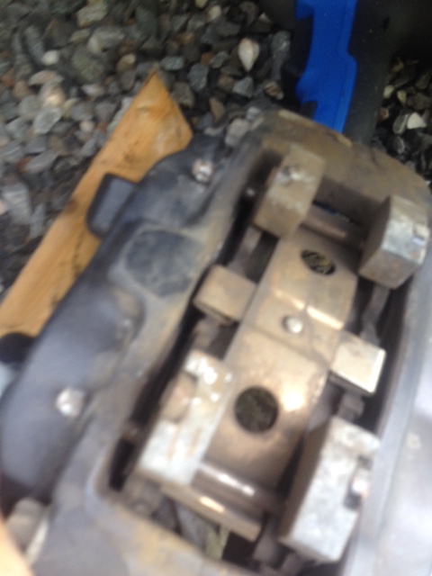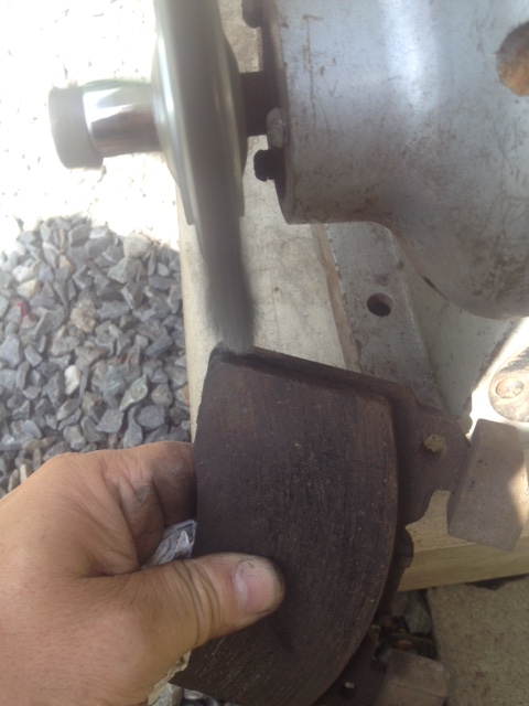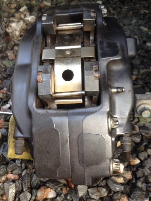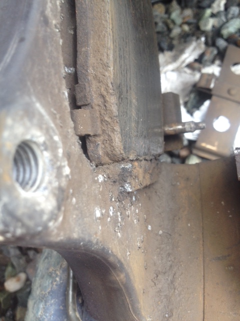 Les pins enlevées, les plaquettes devraient s’enlever pratiquement toutes seules. Hors, dans mon cas, il n’en est rien!!! j’ai pu retirer assez facilement la plaquette du côté lettré de l’étrier, mais celle du côté de la ligne de frein a requis de se déplacer à coups de marteau!!! (Attention de ne pas taper au marteau sur l’étrier, cela lui laisserait des marques, esthétiquement peu intéressantes. Utiliser un bout de bois entre la plaquette et le marteau pour taper. On peut voir sur la photo l’oxyde d’aluminium (blanc-jaune). La plaquette (en acier) avait aussi rouillé. Le volume de la rouille d’acier étant plus gros que le métal pur, c’est cela qui crée le coincement.