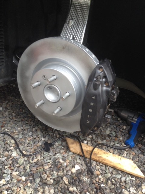 En période de vacance, il n’est rien de plus relaxant que de “minoucher” sa Tesla préférée! 🙂 Hier, donc, je me suis mis à cirer ma voiture et arrivé au moment de cirer les roues, j’ai remarqué que mes roues avant avaient une quantité plus élevée qu’habituellement de poussière de freins. J’ai alors mis un cric de garage sous le point d’appui spécifié de la Tesla et l’ai levée. En tournant la roue à la main, je sentais une résistance à la rotation de la roue libre! C’était 2 points de diagnostic qui m’indiquaient clairement qu’il était temps de faire l’entretien de mes freins!
