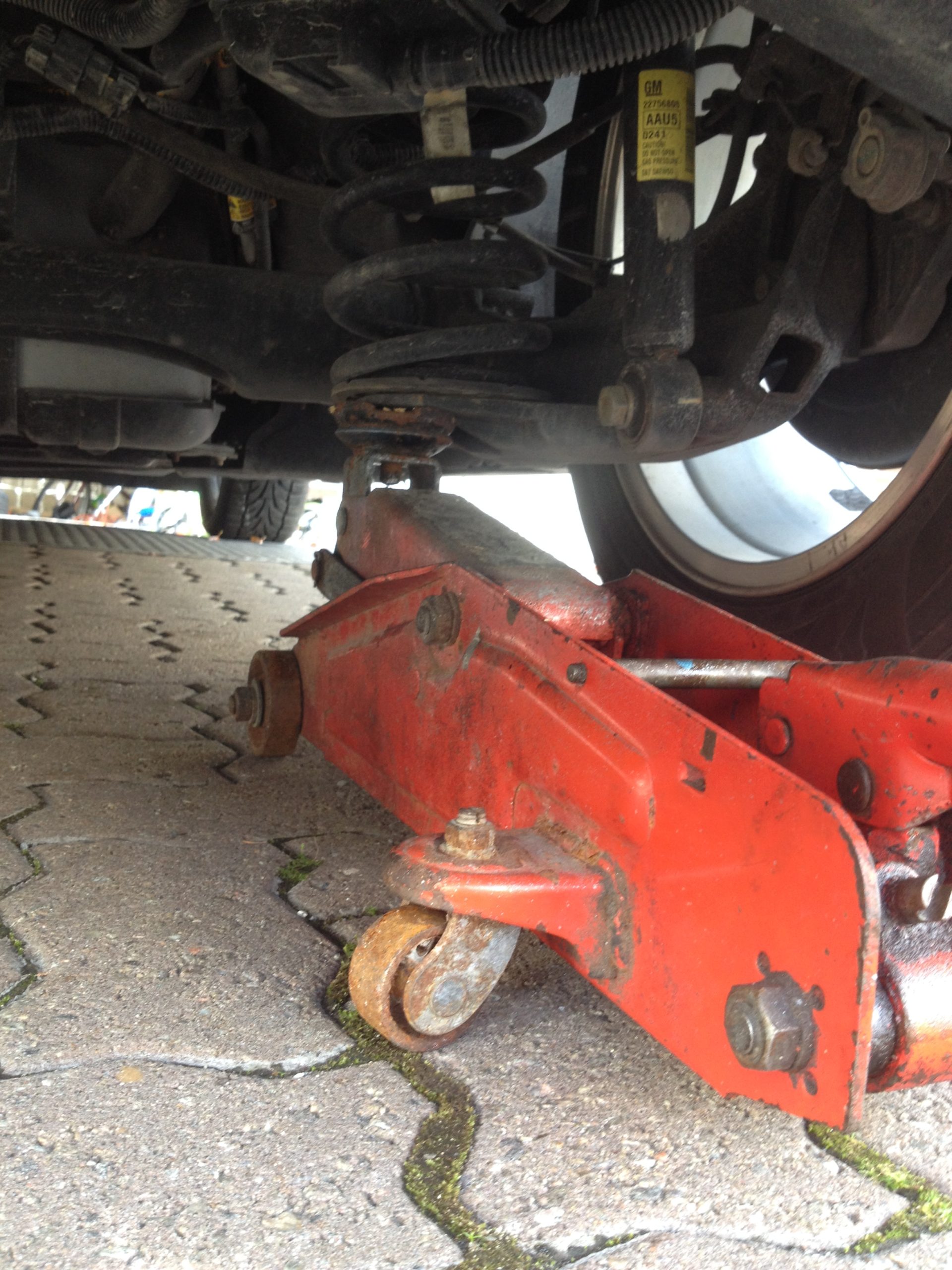 On commence avec le levier de transmission de la Volt sur Park, le frein de stationnement (pour les roues arrière) relaché, et on place un cric d’atelier sous le plateau de support du ressort de suspension.