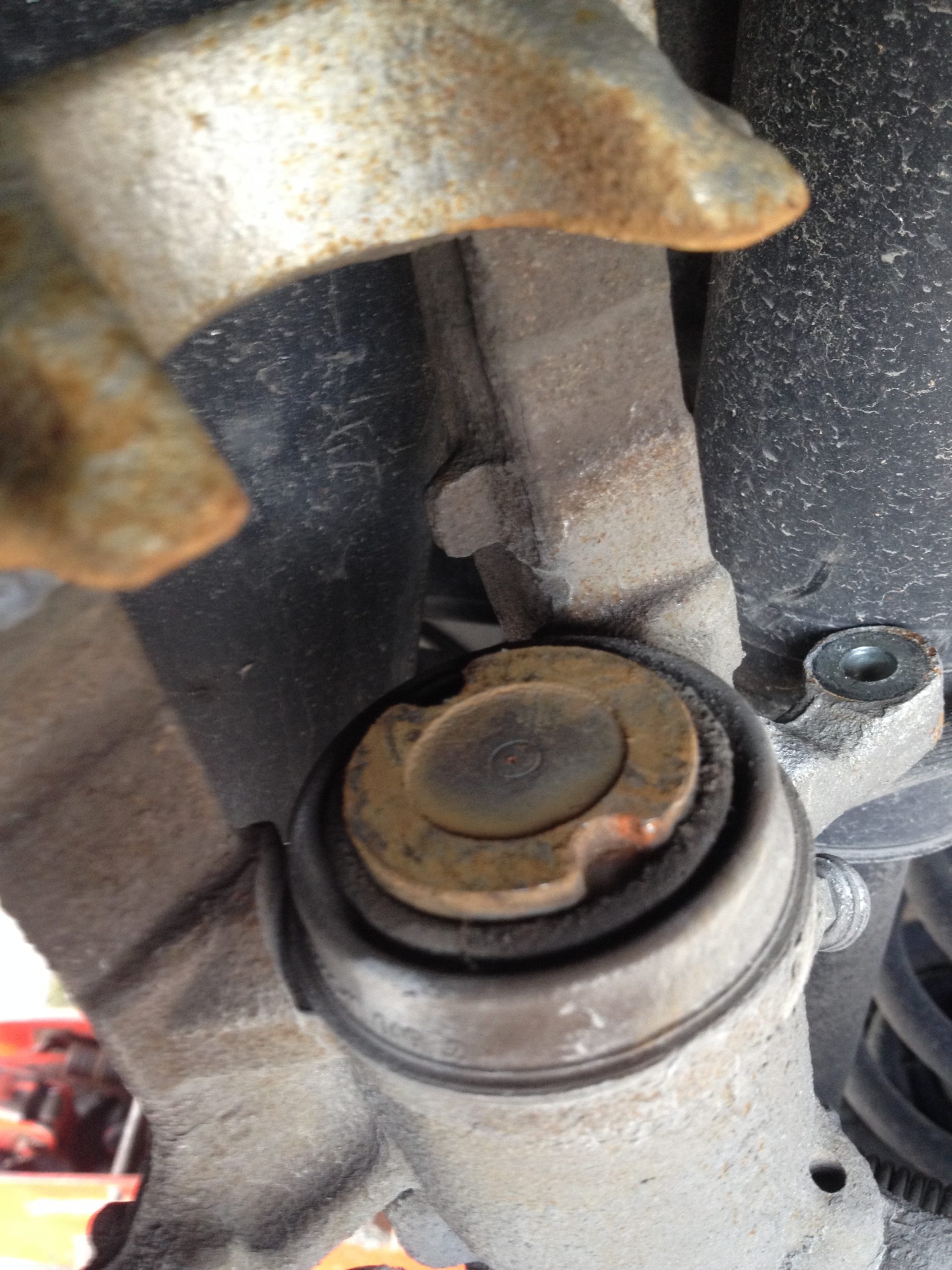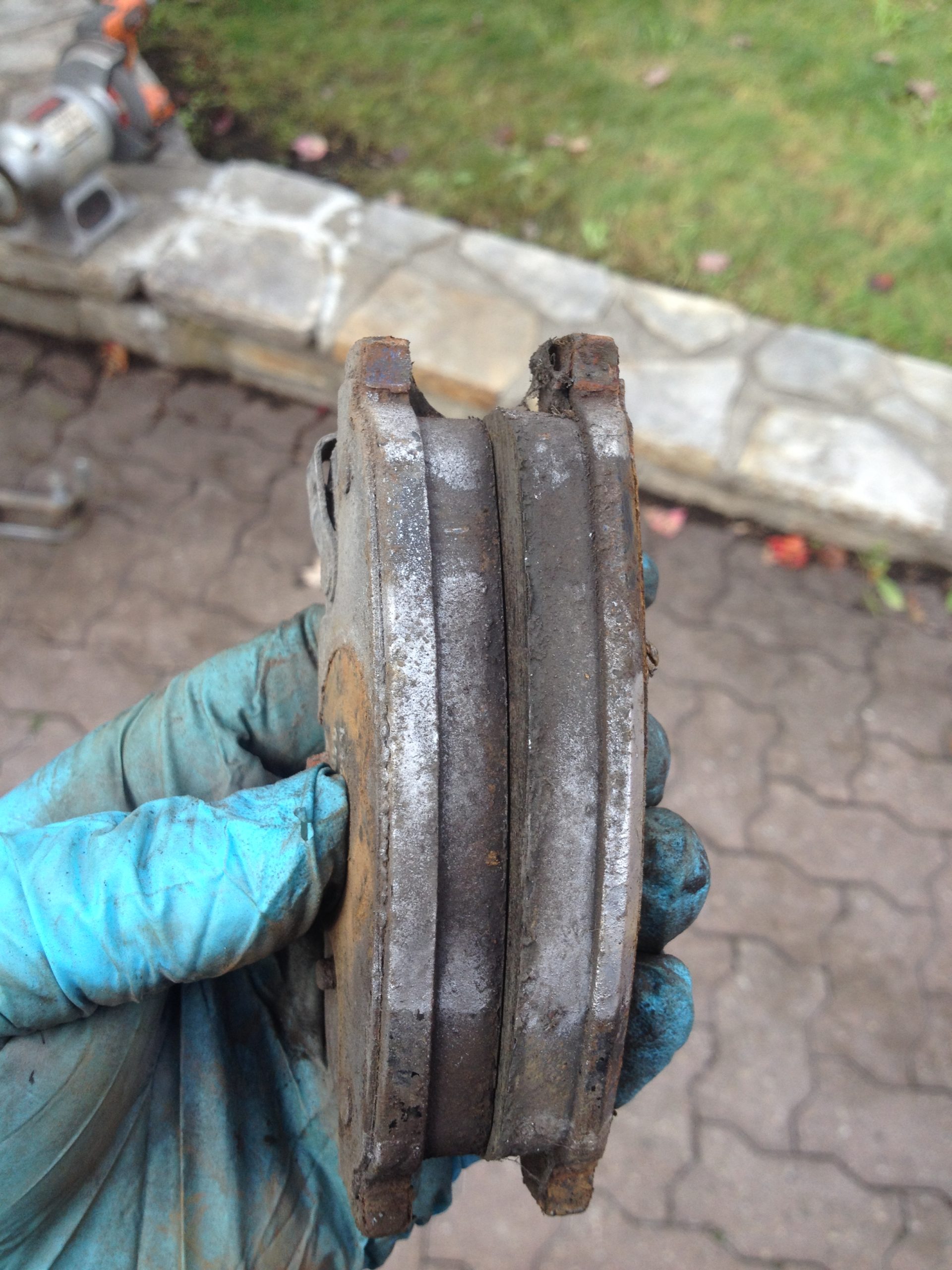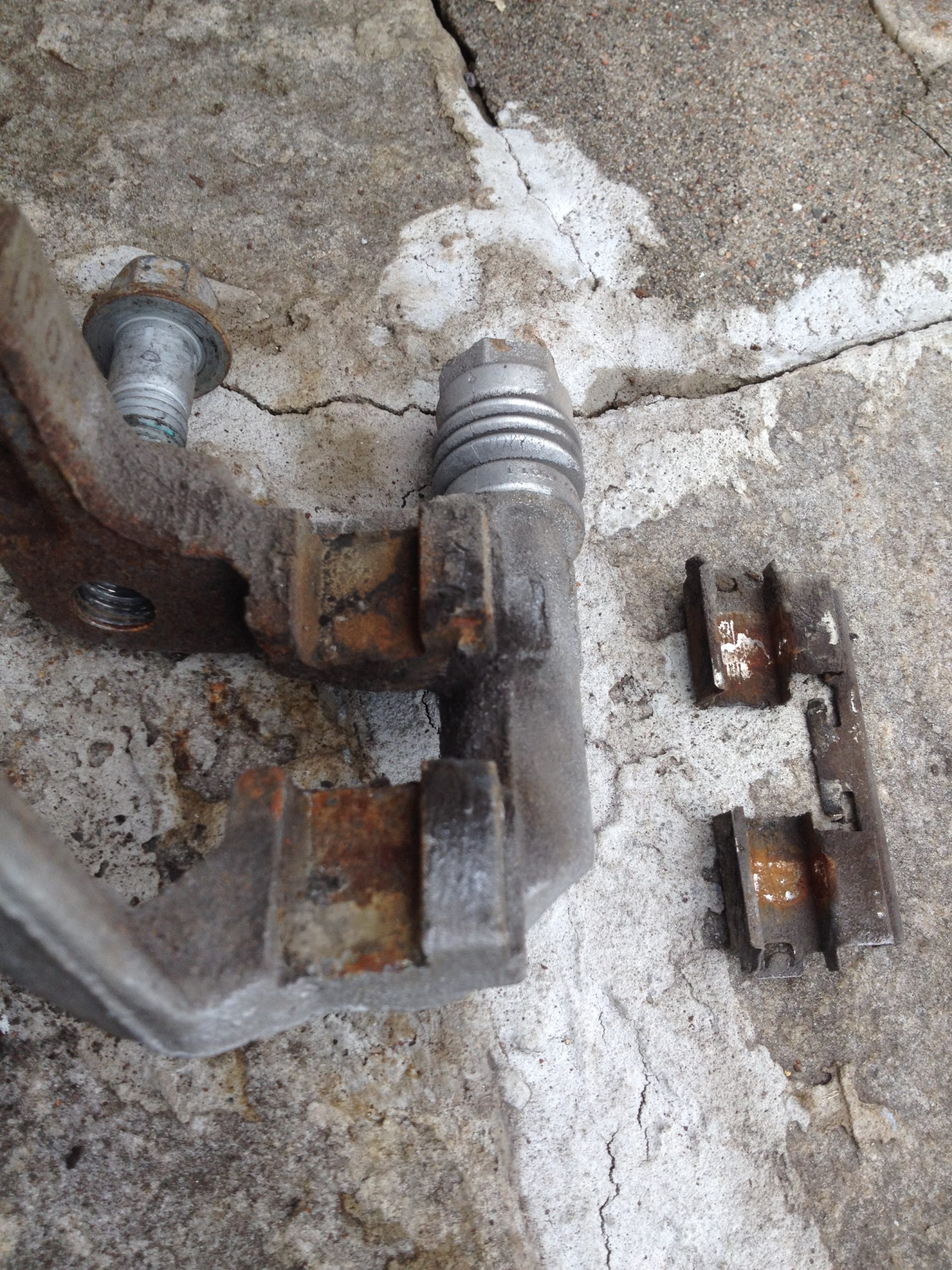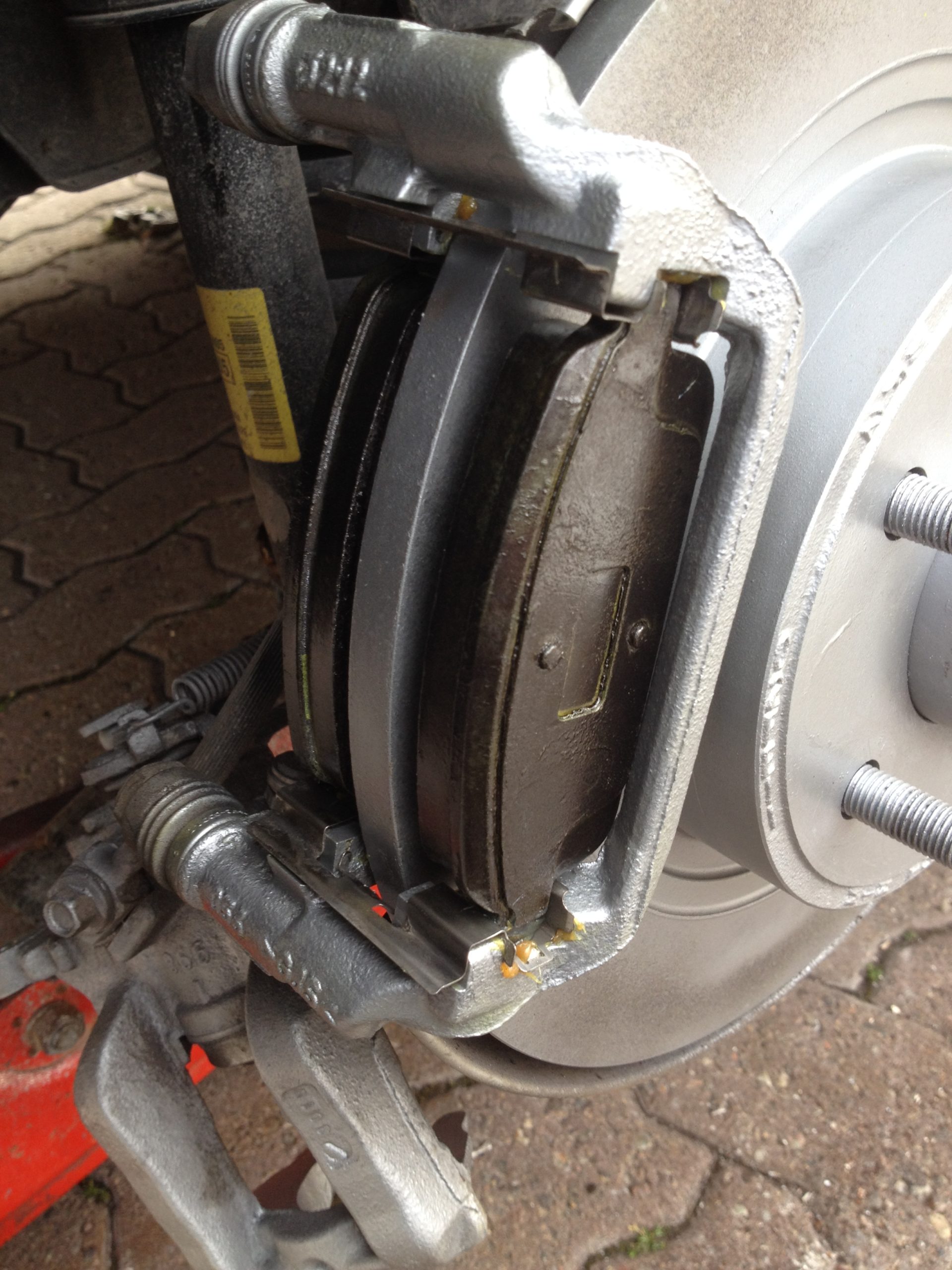 Sur cette photo, on voit la rondelle de plastique découpée et les traces de rouille qui apparaissent sur le bord entre l’étrier et la plaquette de frein.