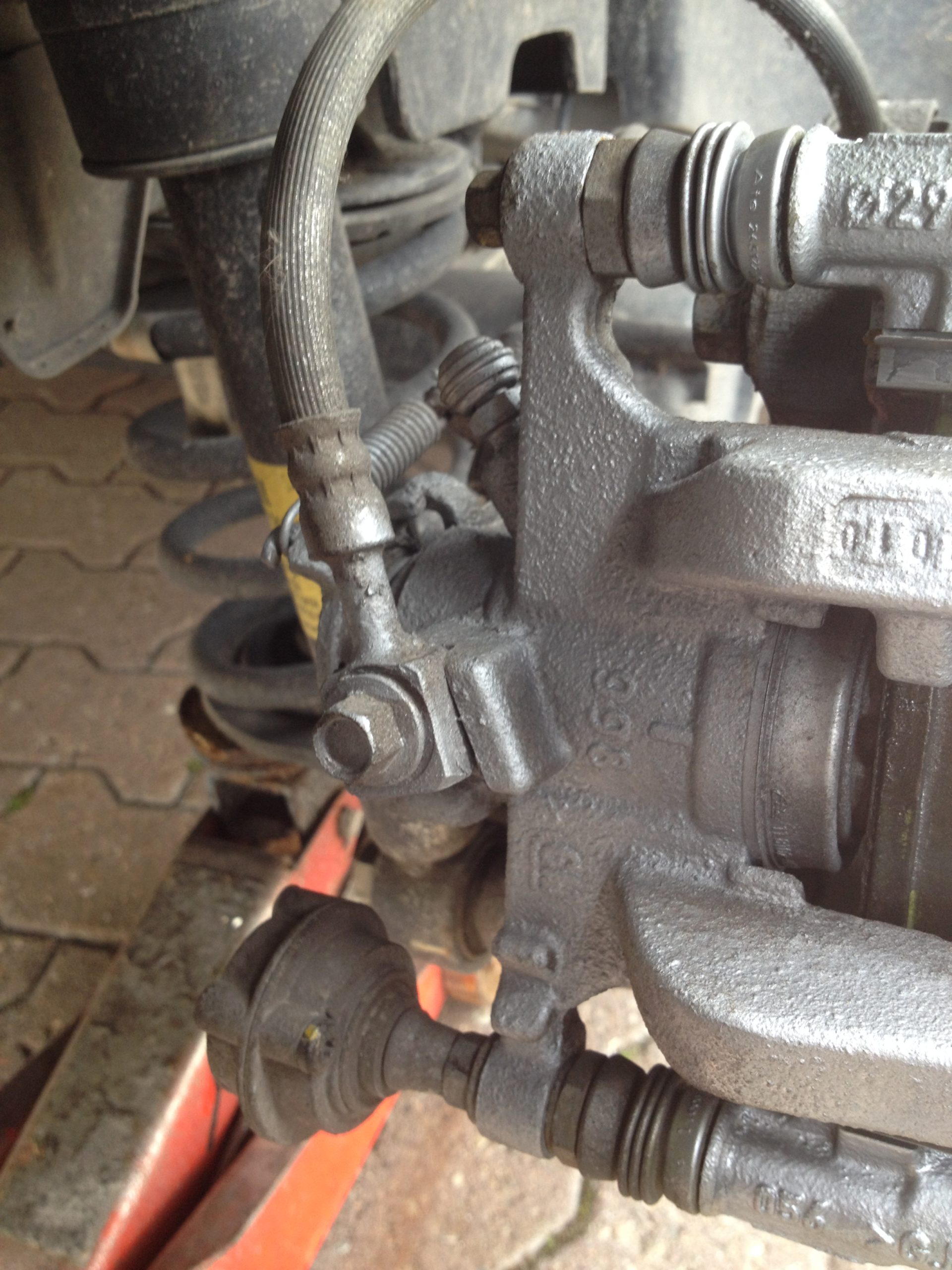 les deux boulons démontés, l’étrier est toujours en place.