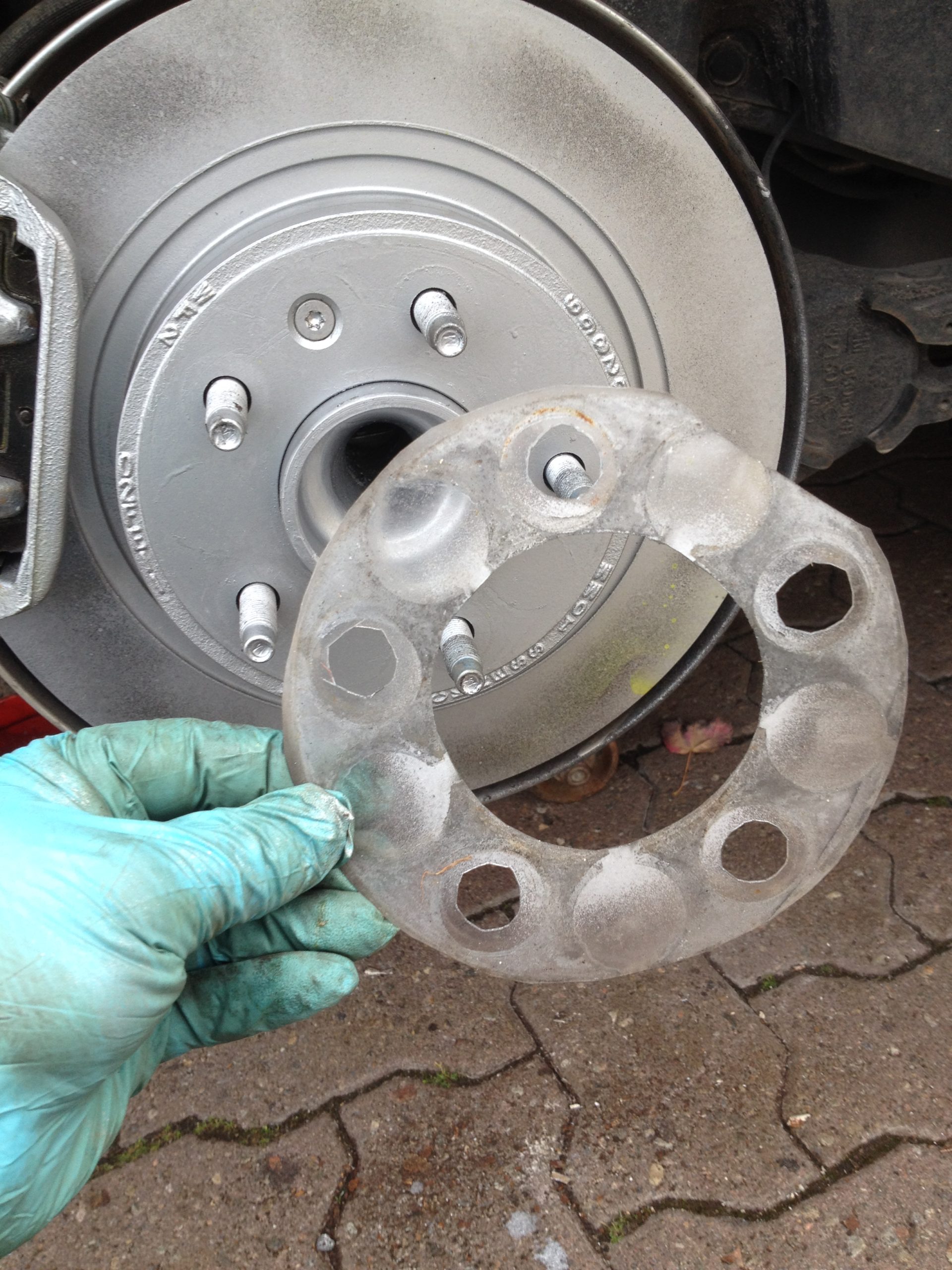 À l’arrière de la roue, on peut voir que la surface normalement en contact avec le rotor de frein est aussi restée impeccable, grâce à l’utilisation d’une barrière diélectrique, simplement fabriquée en coupant avec un couteau (Xacto) du plastique selon les trous de la roue. (J’ai utilisé du plastique pour imprimer une diapositive de rétroprojecteur avec une imprimante laser. Il supporte mieux la chaleur, bien que mes freins n’aient jamais chauffé.)
