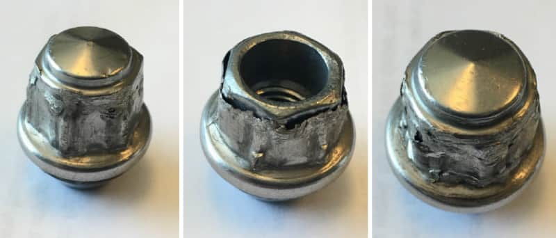 Le problème: Plusieurs manufacturiers de véhicules utilisent pour fixer les roues des écrous (lug nuts) de roue en acier (qui rouille) avec une enveloppe d’acier inoxydable. Cette enveloppe donne une belle apparence à la partie VISIBLE des écrous. L’acier qui s’oxyde forme de la rouille. Cette rouille occuppe un volume près de 3 fois plus grand que l’acier non rouillé. Ainsi, quand on a un écrou de roue qui a une “capote” d’acier inoxydable par dessus s’oxyde, la rouille fait tranquillement gonfler la capote. Quand on arrive avec notre douille de 17mm ou de 5/8po pour l’insérer sur l’écrou … elle ne rentre plus!!! Si on s’obstine à la rentrer de force en tapant dessus avec un marteau, bonne chance pour ressortir la douille par la suite!