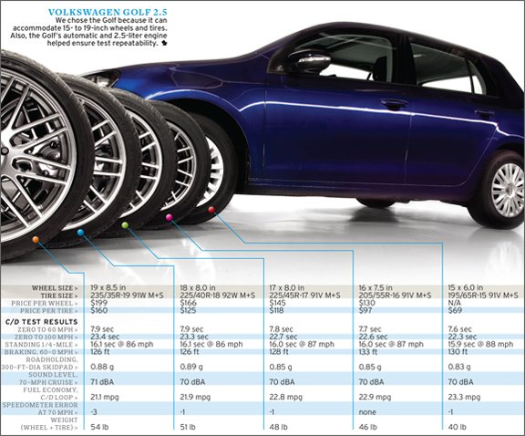 J’aimerais maintenant vous faire part d’une analyse technique poussée par le magasine car and driver publiée en avril 2010 sur l’effet de roues et pneus de dimensions diverses sur une même voiture, une Golf 2010.  Le magasine a utilisé des pneus GoodYear Eagle GT de différents profils et dimension de jantes.  L’effet net: plus vous augmentez la grandeur de vos jantes, plus l’accélération de 0 à 100km/h est diminuée,  et plus la consommation d’essence augmente.  Consultez l’article en référence, pour tous les détails.  En passant, l’effet gyroscopique se fait montrer par le nombre de g latéraux qui diminue avec des roues plus grandes, de 18 à 19 pouces.