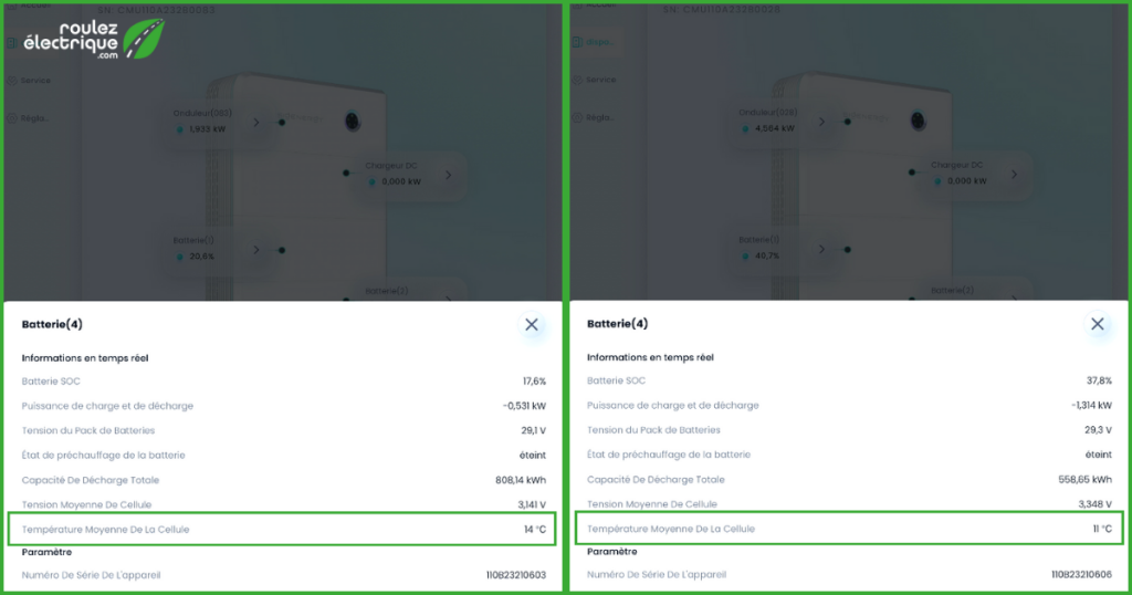 Les données que j’ai recueillies sont impressionnantes. Le jour de mes tests, il faisait -8°C dehors. Dans mon garage chauffé, la température ambiante était de 17°C. Les batteries dans ce garage affichaient 11°C pour la batterie du bas et 15°C pour celle du haut. C’est normal, la chaleur monte.