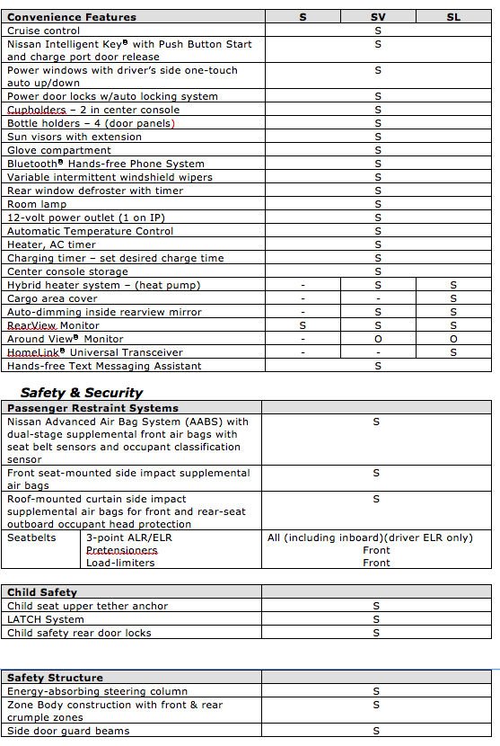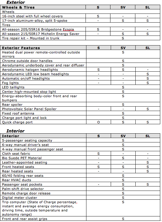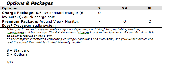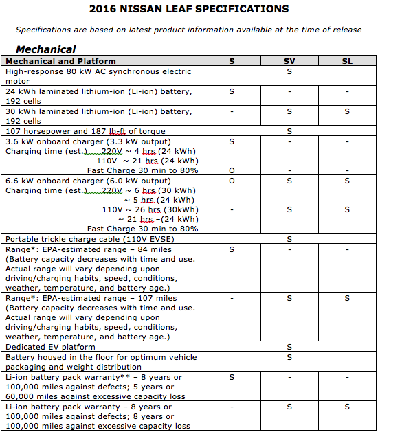 Il est aussi à noter que la Leaf 2016 S vient avec un chargeur de 3.3 kW standard, 6.6 kW optionnel. Les versions SV et SL viennent avec le chargeur de 6.6 kW livré d’usine.