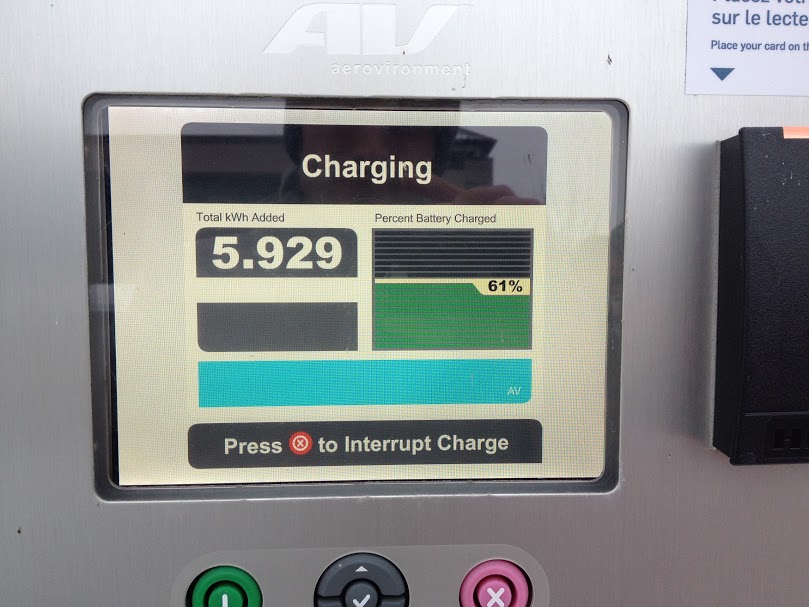 Comme l’indiquait Hydro-Québec dans son communiqué, la vitesse de chargement est plus lente en hiver. En ce qui me concerne, ça a pris presque une heure pour ajouter 9 kWh dans la batterie alors qu’il faisait -3 degrés Celcius. C’est en gros trois fois plus rapide que le chargeur de niveau 2 de la Leaf 2012. Pour une Leaf 2014, ça peut ne pas sembler aussi intéressant, mais les premières données semblent indiquer que la recharge est plus rapide au début. Donc, pour quelqu’un qui a besoin de seulement quelques kWh supplémentaires pour se rendre à destination, la recharge rapide semble être une solution intéressante, même par temps froid.