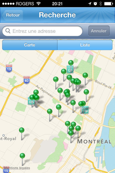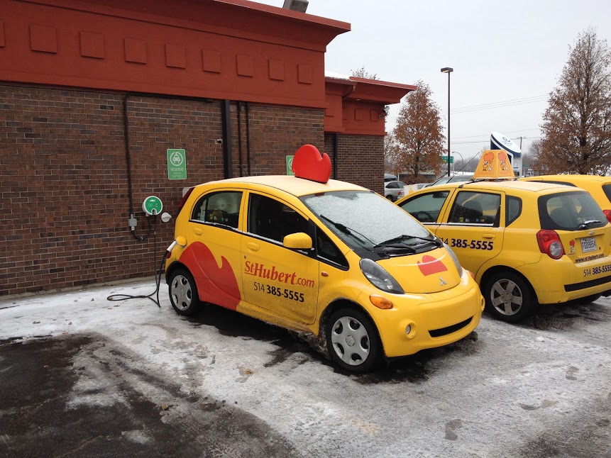 Depuis le temps que j’attendais l’ouverture de cette borne au grand public, j’ai fait tout ce qui était possible pour aller tester cette fameuse borne rapide ce week-end. Ce n’était pas évident car les Leaf de Communauto sont maintenant offertes en libre service dans un territoire assez grand, soit les arrondissements du Plateau Mont-Royal, Rosemont et Côte-des-Neiges. Communauto m’a informé qu’ils possèdent neuf Leaf munis du chargeur CHAdeMO. Ils m’avaient également fourni les numéros de deux véhicules. Hier, j’ai profité des mes déplacements pour en identifier deux autres. Ce matin, j’ai donc pu localiser celle qui était la plus proche de chez moi. Elle était sur la troisième avenue, près de Masson. J’ai donc utilisé une Smart de Car2Go stationnée près de chez moi pour m’y rendre.
