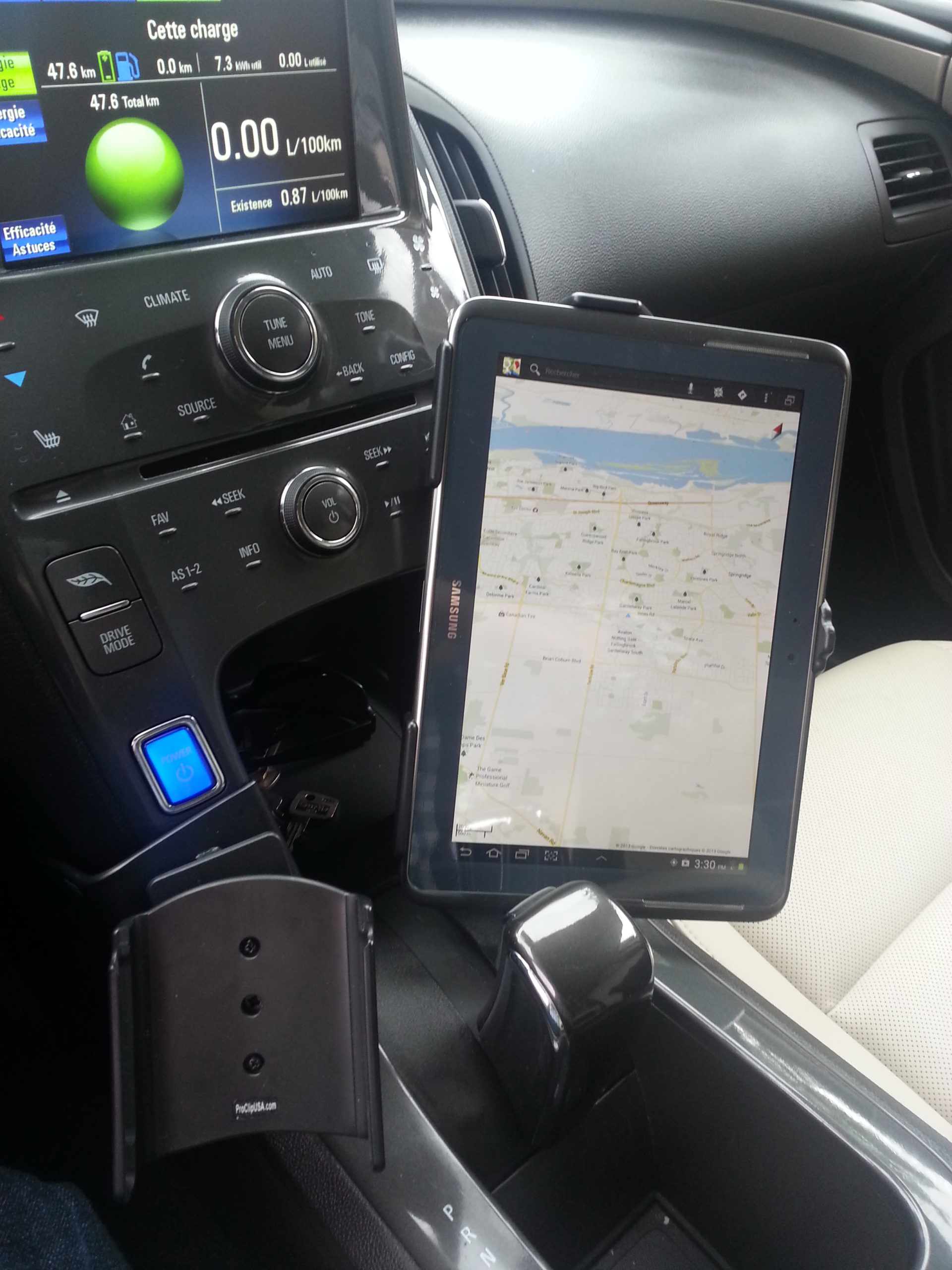 En conduisant la Tesla Modèle S de Sylvain, je me suis dit que je peux compléter ma Volt Rouge avec un support pour ma tablette Samsung Note de 10.1”. Avec le site ProClipUSA, j’ai donc commandé la monture pour la Volt ainsi que le support pour la tablette. Le tout a été livré à la maison en 4 jours ouvrables.