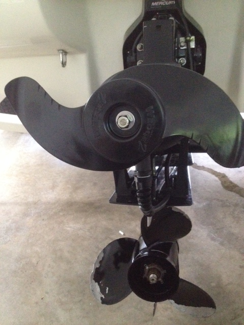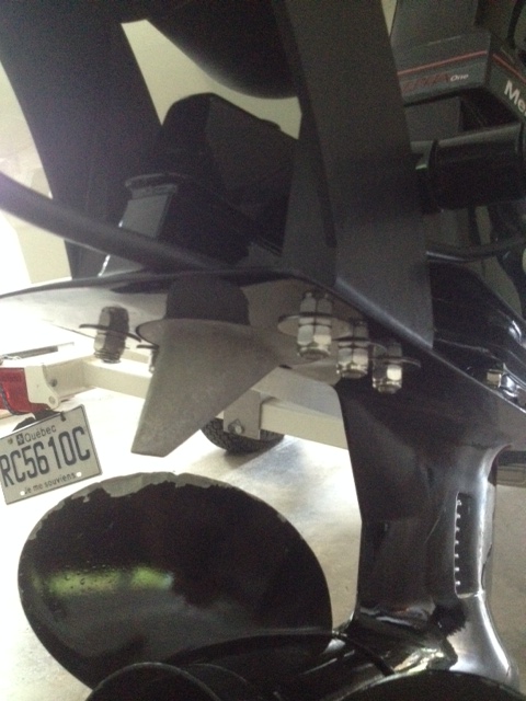 Ainsi donc, je me suis procuré un moteur à montage sur pied. Ce type de moteur de bateau fonctionne avec batterie électrique, et est monté sur le pied d’un moteur de bateau existant. En tournant le volant de direction, autant le moteur à essence que le moteur électrique se trouve à s’orienter ensembles. Cela rends le moteur électrique très simple à utiliser! On n’a pas non plus un moteur avec sa tige installé sur le nez du bateau, ce qui est une nuisance. Un bouton rotatif avec un petit fil sert de télécommande pour contrôler la vitesse du moteur, autant pour avancer que reculer. Il ne faut pas faire fonctionner le moteur thermique quand le moteur électrique est mis en marche.