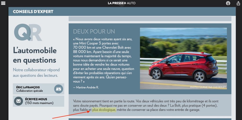 Voici deux exemples où il était de mise selon moi de rappeler au public que la voiture électrique est un meilleur choix pour l’environnement et où, malheureusement, ça n’a pas été fait.