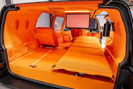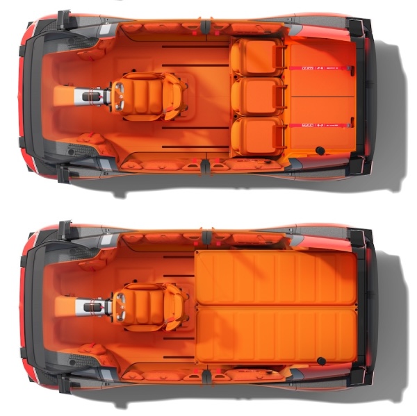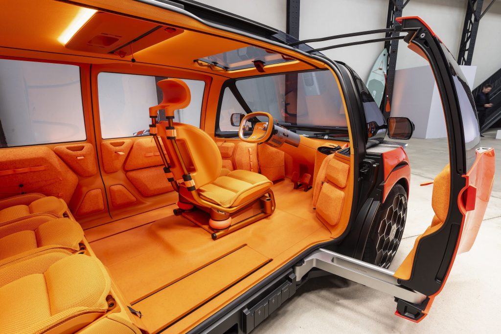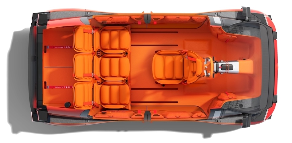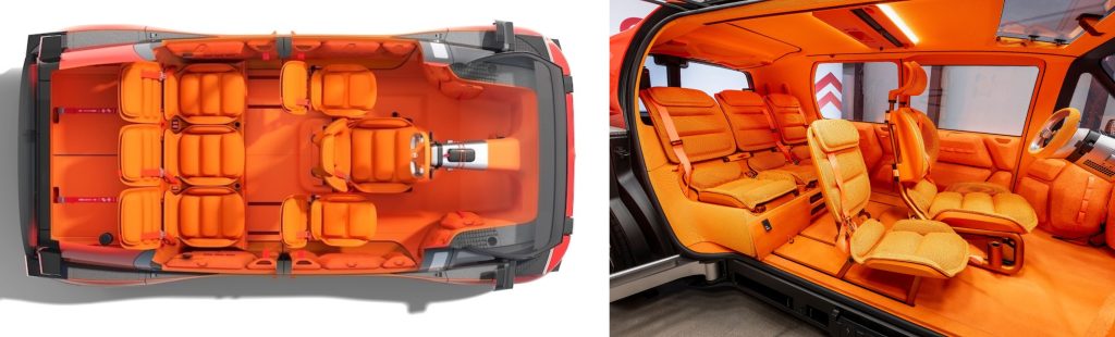 De plus, sachez que les trois sièges arrière peuvent être retirés et installés à l’extérieur (pour un pique-nique) ou rangés dans un garage. On peut donc se retrouver avec un espace de chargement fantastique. Il y a même une télé au plafond !