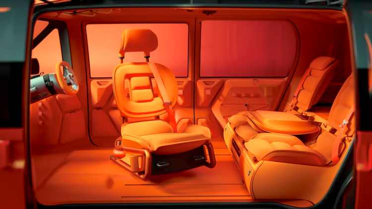 Regardez la photo ci-dessous. On voit cette télé accrochée au plafond. (On semble d’ailleurs avoir oublié de l’éteindre !) Et regardez le mécanisme des portes : aucun montant central. Ce genre de portes existe déjà sur certains VÉ chinois comme le Zeekr Mix. (J’ai déjà écrit un article là-dessus : lien.)