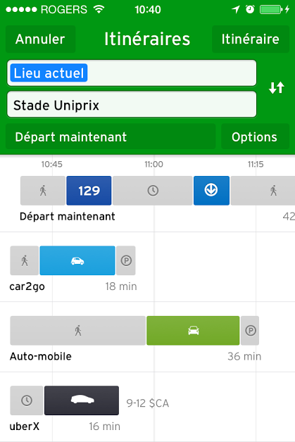 J’ai fait le test en septembre et octobre pour voir si c’était réaliste et économique de libérer les voitures quand c’était possible pour moi. Comme une bonne partie de mes utilisations de ce service servent à aller à l’aréna, ma voiture est généralement garée entre 1h30 à 2h30. Je réussis aussi généralement à me rendre à la plupart des arénas inclus dans la zone VLS en moins de 30 minutes. Parfois, la voiture que j’avais utilisée était toujours disponible. Mais la plupart du temps, elle n’était plus là et il y avait une autre voiture à proximité. J’ai bien entendu rencontré des situations où les voitures étaient assez éloignées. Selon mes contraintes de places et de temps, j’ai parfois dû utiliser Bixi ou rentrer en Car2Go. Ce qui est bien maintenant, c’est qu’il y a tellement d’options de mobilité à Montéral qu’on n’est jamais pris au dépourvu. Grâce à l’application Transit app, je peux facilement trouver les Bixi, Car2Go, Auto-mobile à proximité. Et quand il n’y a rien, je peux voir automatiquement une estimation du temps d’attente et le coût de la course en UberX. Mais je n’ai pas eu à l’utiliser, car mon seul trajet en taxi pour les 2 mois était un déplacement en famille au centre-ville. Car malheureusement, l’administration municipale bloque les VLS dans Ville-Marie depuis 2 ans maintenant.