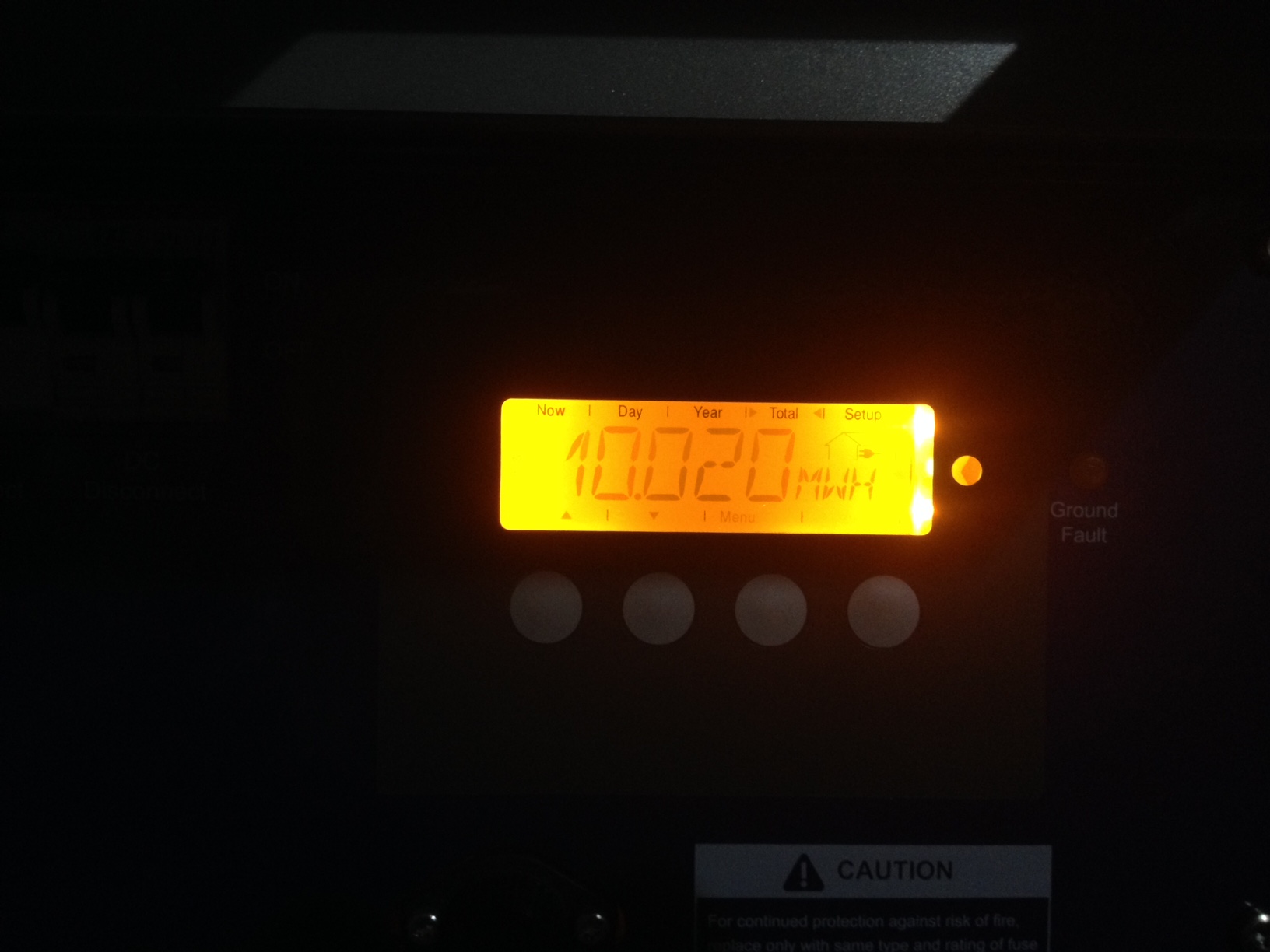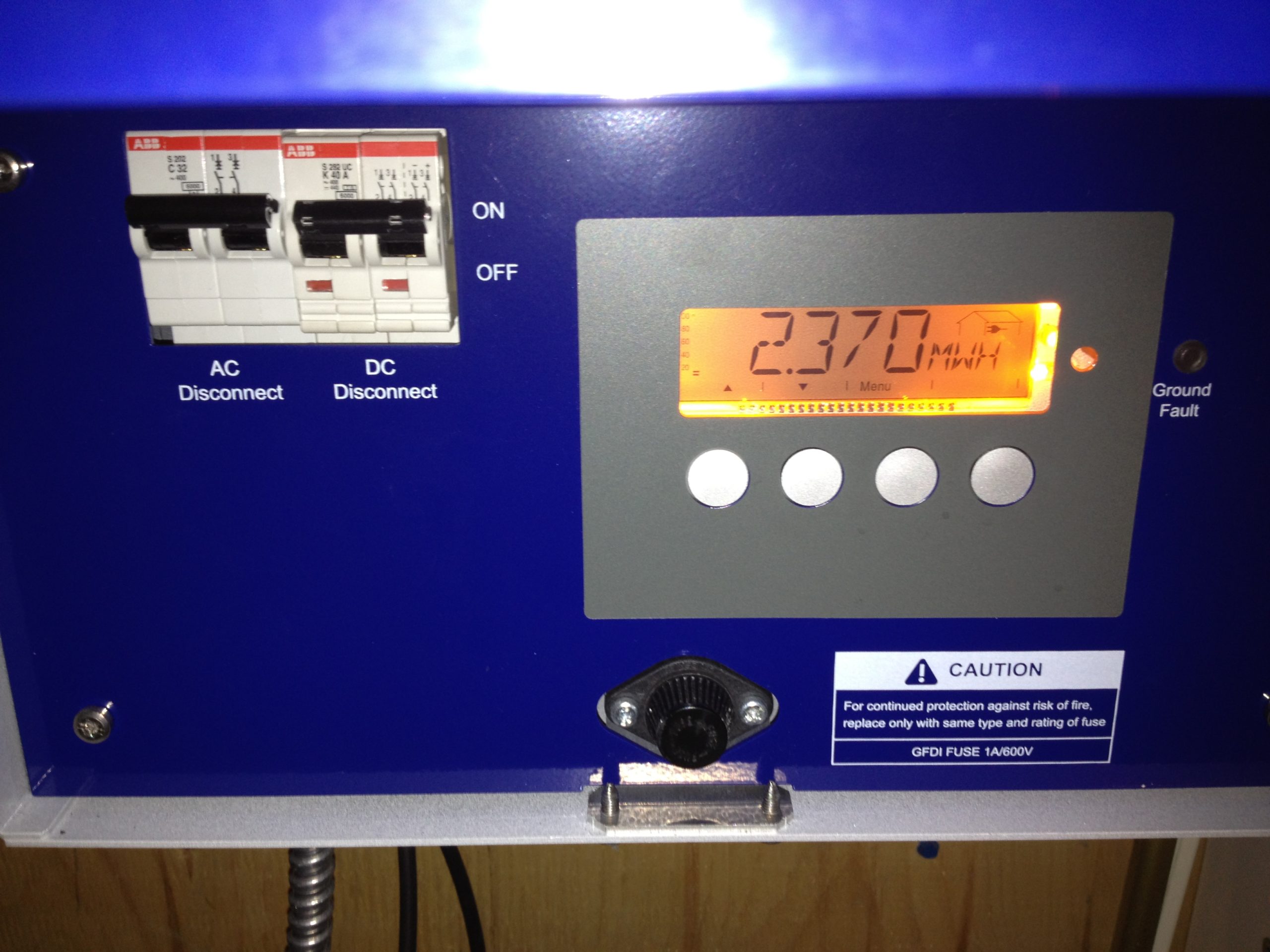 Les panneaux sont connectés en série, donc leur voltage s’additionne. Ainsi, 10 panneaux de 33Volts en circuit ouvert donnent 330Volts fournis vers l’onduleur. Ne vous mettez pas les doigts sur les fils nus pendant la période d’ensoleillement! J’ai relié les panneaux à l’entrée d’isolation de l’onduleur pendant qu’il faisait noir, les panneaux sont alors inertes. Pour partir du toit (là où sont les panneaux) vers la chambre électrique, il faut acheter un câble certifié UL4703 avec connecteurs MC4. Un câble de 100 pieds a suffit à remplir cet objectif ($80 via Ebay en provenance de Laval: http://www.solarenergydc.com) J’ai coupé le câble à la longueur requise pour chaque polarité de mon groupe de panneaux, puis emmené les câbles dans un conduit jusqu’à la salle électrique. Selon le code de l’électricité, chaque panneau qui produit plus de 30 Volts doit être mis à la terre. Un fil de terre en cuivre est donc relié au châssis d’aluminium de chaque panneau dans ce but. Le fil de terre suit les câbles dans le conduit jusqu’à l’onduleur, où une borne de détection de faute de masse est utilisée pour le connecter.