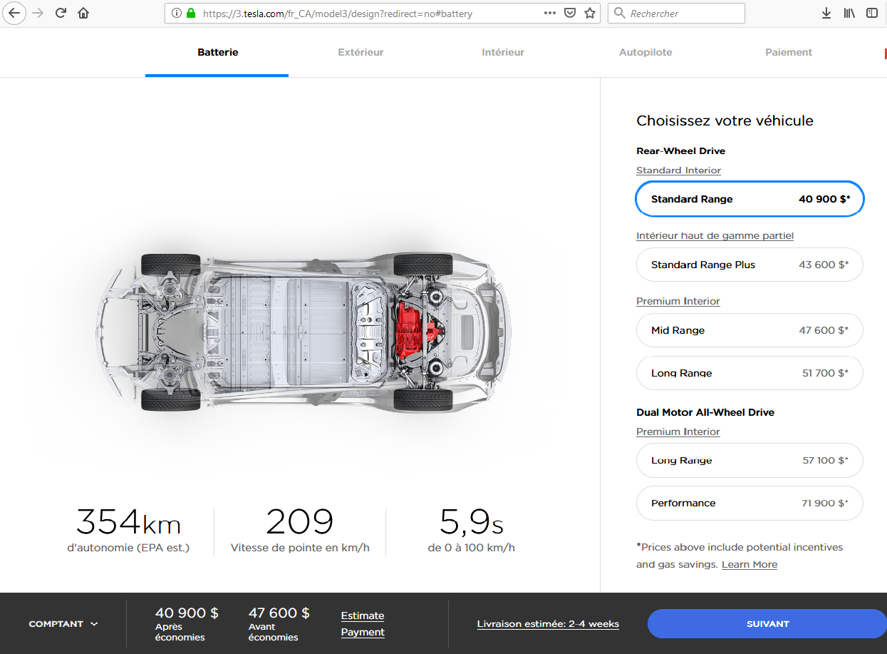 Grande nouvelle cette semaine : la modèle 3 à prix “abordable” est maintenant offerte !!! En effet, Tesla a annoncé le 28 Février la mise en marché de la modèle 3 au Canada pour un prix de base de $47600, plus $1300 de frais de transport et documentation. La voiture vient équipée d’un toit vitré, roues aéro de 18 pouces de diamètre, d’une autonomie EPA de 354km, 0 à 100km/h en 5.9s. Le délai de livraison est très court : de 2 à 4 semaines !!!
