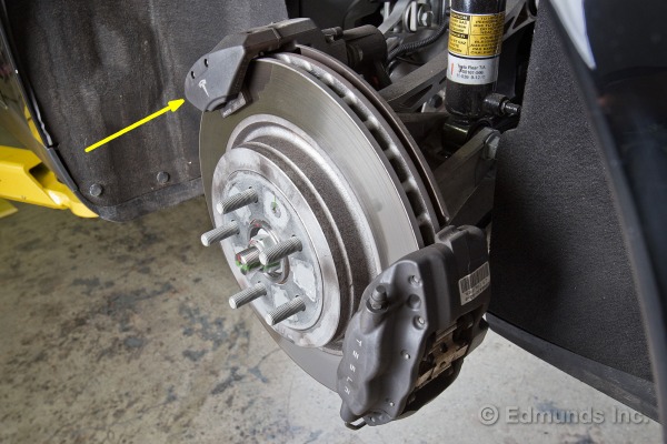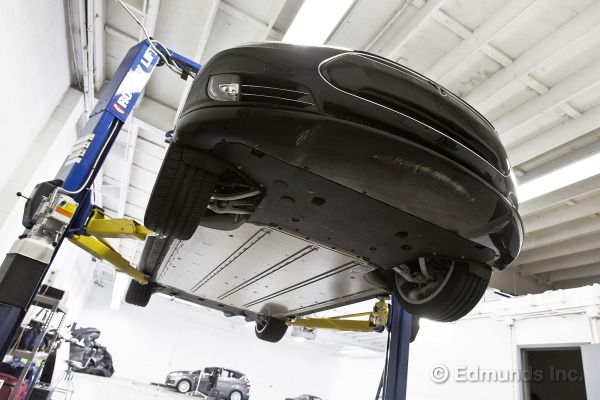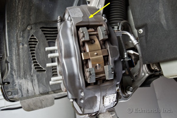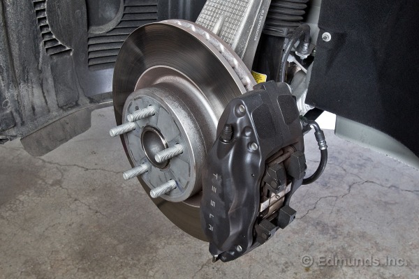 L’étrier de freins Brembo à 4 pistons serre les plaquettes sur un disque en acier ventilé et massif de 14 pouces de diamètre et 1.3 pouce d’épaisseur. Cet arrangement est plus que suffisant pour arrêter une voiture de 4770 livres. Il faut aussi garder en mémoire que les arrêts de routine (jusqu’à 0,25g) sont gérés par le moteur électrique qui récupère l’énergie de mouvement en la convertissant en électricité et la retourne dans la batterie. Mais la preuve d’efficacité est dans la distance d’arrêt de 100km/h à 0 en 108 pieds, et sans dégradation ou allongement avec 6 essais consécutifs.