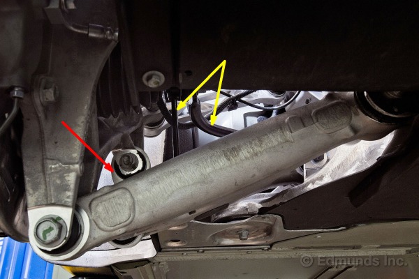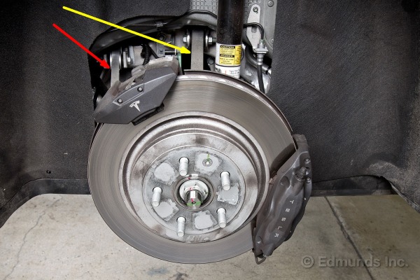 La bielle de direction (tie rod end identifiée par la ligne jaune) est placée en avant de la suspension à double A. Sur beaucoup de voitures à essence, elle est placée derrière. Cette configuration permet de libérer vers l’avant de l’espace au niveau plancher pour la batterie de 85 kWh (ligne rouge).