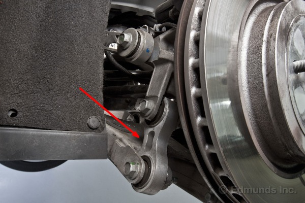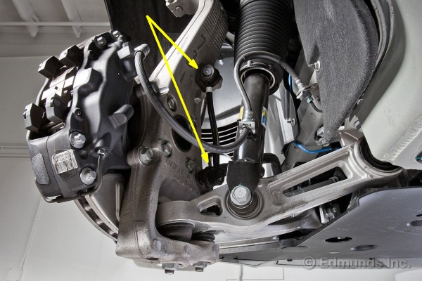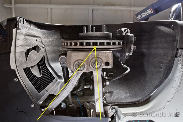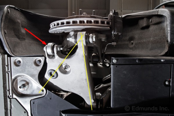 L’utilisation étendue de l’aluminium dans les pièces de suspension permet de garder le poids non suspendu à un niveau minimum. Le knuckle massif est avec des cavités pour l’alléger. On peut voir (flèches jaunes) le lien avec la barre stabilisatrice, qui est pratiquement vertical et s’attache directement au knuckle (au bout de la table en A inférieure), ce qui amène un rapport de 1 pour 1 dans l’effet du mouvement vertical de la suspension avec cette barre. Cette conception optimise l’effet de la barre stabilisatrice, ce qui permet de ne pas avoir à la grossir et la rendre plus pesante que nécessaire.