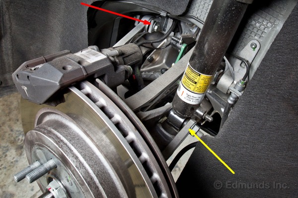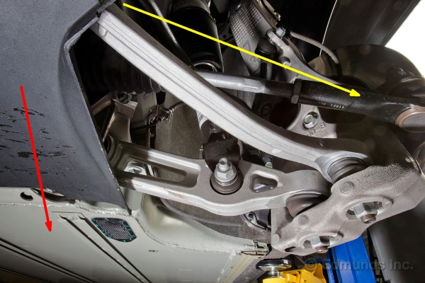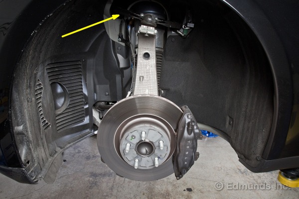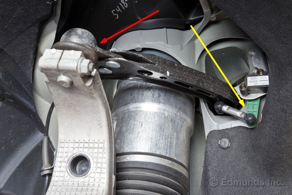Comme pour la suspension avant, on peut voir pointé par la flèche jaune le lien qui relie la suspension au senseur de hauteur qui permet à l’ordinateur d’avoir le feedback nécessaire afin d’ajuster la pression d’air dans les amortisseurs pneumatiques pour bien gérer la hauteur de la voiture par rapport à la route. La flèche rouge pointe vers une ouverture dans le chassis arrière (rear sub frame), qui est en aluminium et est creux pour en optimiser le poids.