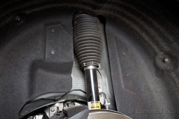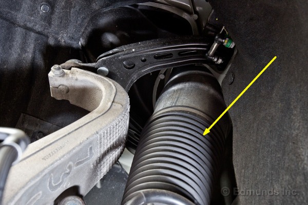 Cette protection en caoutchouc protège l’amortisseur à pression Bilstein. Cela remplace/élimine le ressort de suspension habituel par une pression d’air. Cela diminue aussi le poids non suspendu. Un compresseur contrôlé par ordinateur génère la pression d’air requise pour monter ou descendre la voiture selon les volontés du conducteur, la charge à bord (nombre de passagers) et les conditions de conduite: à vitesse d’autoroute, le système abaisse automatiquement la suspension de façon à diminuer la quantité d’air qui passe sous l’auto et donc les pertes d’énergie par écoulement de l’air. La hauteur nominale est de 6 pouces, on peut monter la voiture de deux niveaux pour permettre le passage d’une entrée de garage difficile ou de passer un obstacle. À vitesse d’autoroute le système abaisse la voiture sous les 6 pouces. Sur cette photo, on voit très bien la table triangulée du haut de la suspension (en noir).