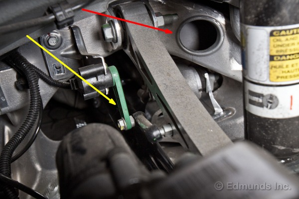 Un petit lien mécanique (en jaune) relie la table de suspension du haut à un senseur de hauteur (en vert), qui permet à l’ordinateur de bien gérer la hauteur de suspension par l’envoi ou le retrait d’air dans l’amortisseur. La table du haut, en acier, a un ball joint qui y est riveté. L’utilisation de l’acier au lieu d’aluminium ne représentait pas une pénalité de poids trop importante.