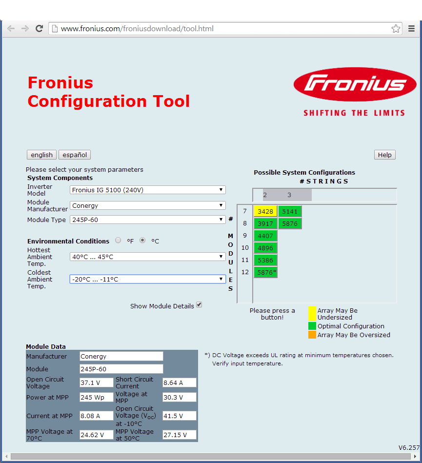 Un outil logiciel de configuration des panneaux est disponible sur le site de la cie, Fronius.  On y entre simplement le modèle d’onduleur, la marque et modèle des panneaux et l’outil nous indique quelle configuration optimale utiliser.  Voici un exemple copié collé de cet outil pour mon installation.