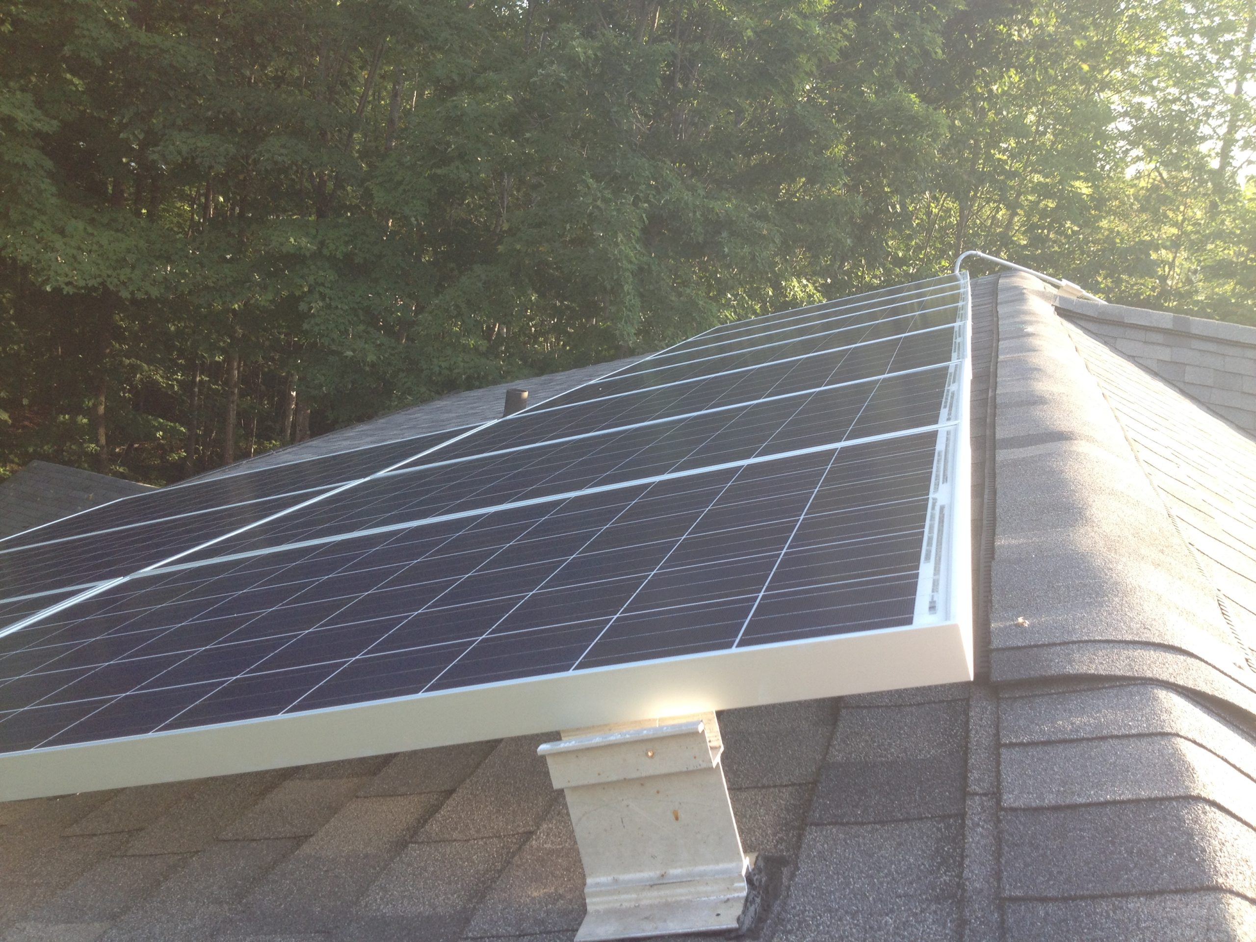 Éric Carrière m’a beaucoup aidé à monter les panneaux solaires sur le toit du chalet.  Essentiellement, c’est une job de bras: chaque panneau pèse 45 livres et les hisser sur le toit constitue tout un exercice!  Pour diminuer le temps sur le toit, on fixait les supports avec les boulons en inox au sol avant de monter le tout sur le toit.  Il suffisait ensuite de mettre le ciment plastique, et de visser la vis d’attache au toit pour chaque support.  (2 vis par support).  Poser les 10 panneaux nous a demandé une journée d’ouvrage.