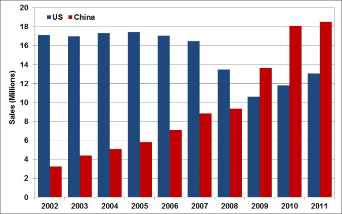 Selon des statistiques compilées par le département américain de l’énergie, les ventes de véhicules en Chine ont atteint 18.5 millions dans l’année 2011. Par comparaison, les ventes aux USA en 2011 ont été de 13.0 millions.